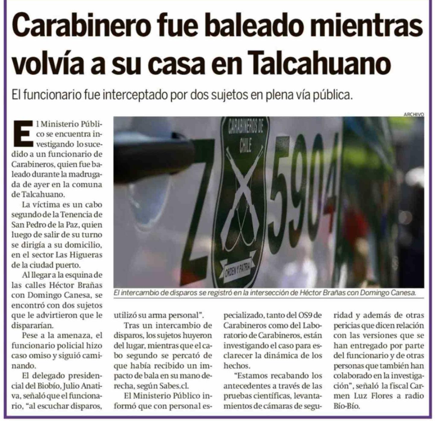 Título: Carabinero fue baleado mientras volvía a su casa en Talcahuano