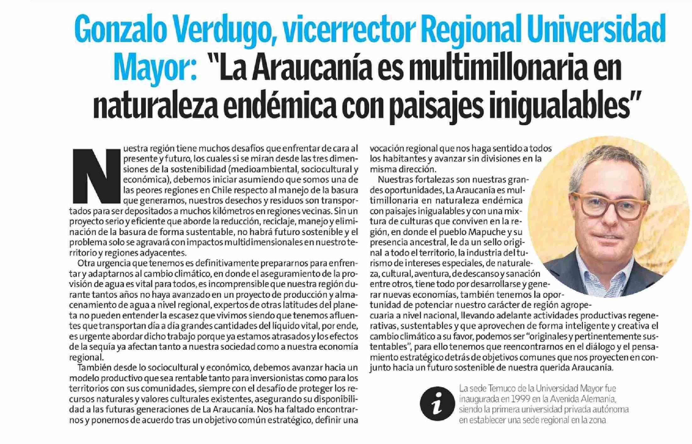 Gonzalo Verdugo, vicerrector Regional Universidad Mayor: "La Araucanía es multimillonaria en naturaleza endémica con paisajes inigualables” 30-03-2026 El Austral de la Araucanía |