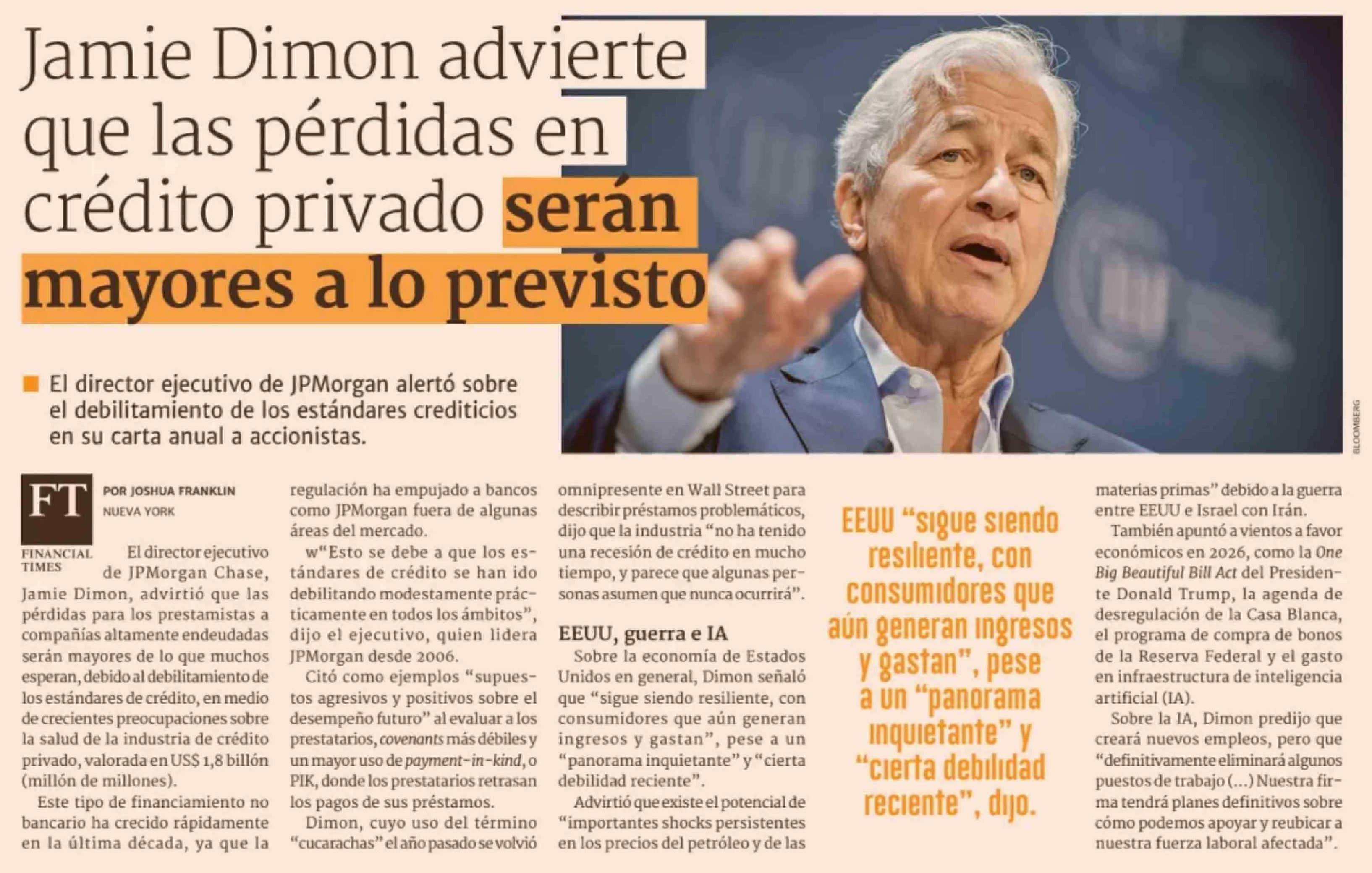 | Título: | Jamie Dimon advierte que las pérdidas en crédito privado serán mayores a lo previsto |