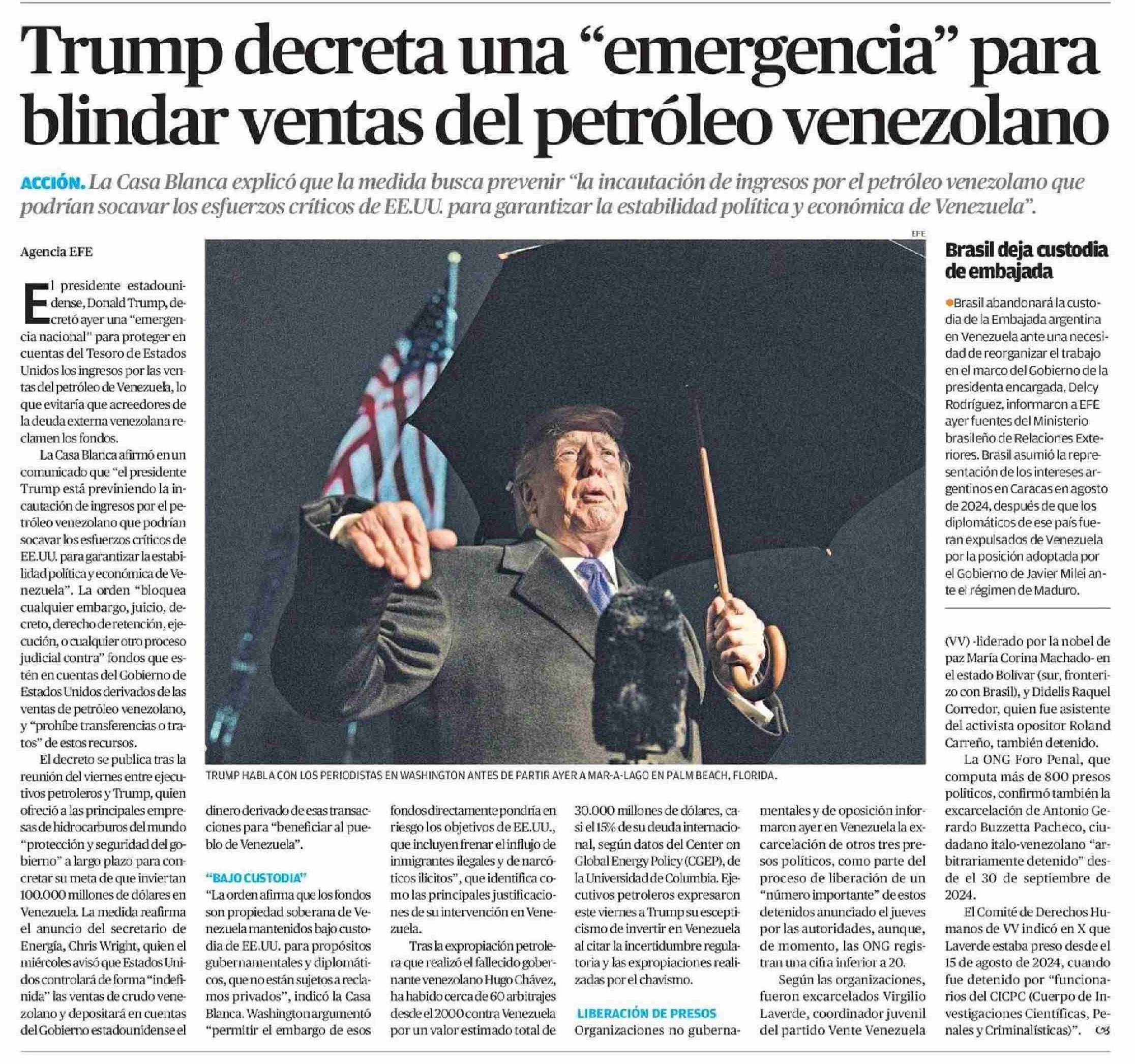 | Título: | Trump decreta una "emergencia" para blindar ventas del petróleo venezolano |