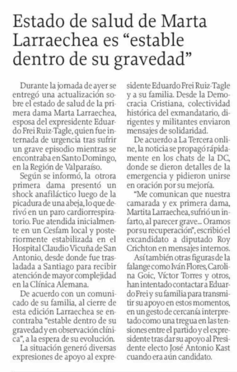 | Título: | Estado de salud de Marta Larraechea es "estable dentro de su gravedad" |