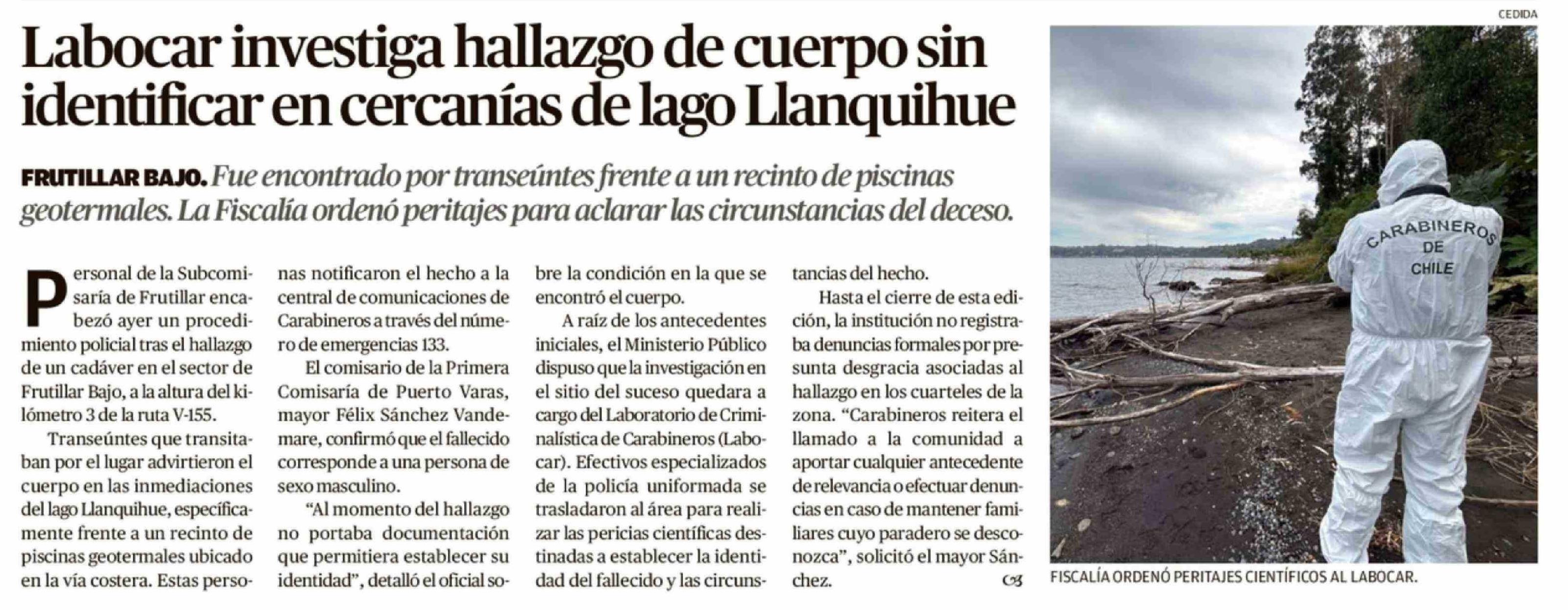 Título: Labocar investiga hallazgo de cuerpo sin identificar en cercanías de lago Llanquihue