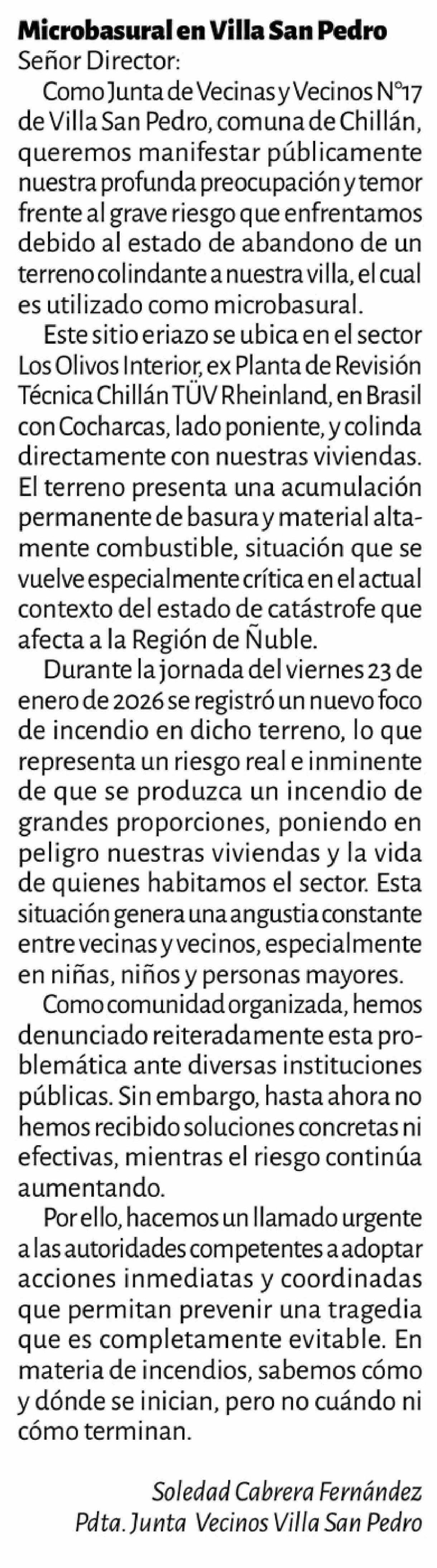 Título: Cartas: Microbasural en Villa San Pedro Señor Director: Como Junta de Vecinas y Vecinos Nº17 de Villa San Pedro, comuna de Chillán, queremos manifestar publicamente nuestra profunda preocupación y temor frente al grave riesgo que enfrentamos debido al estado de abandono de un terreno colindante a nu
