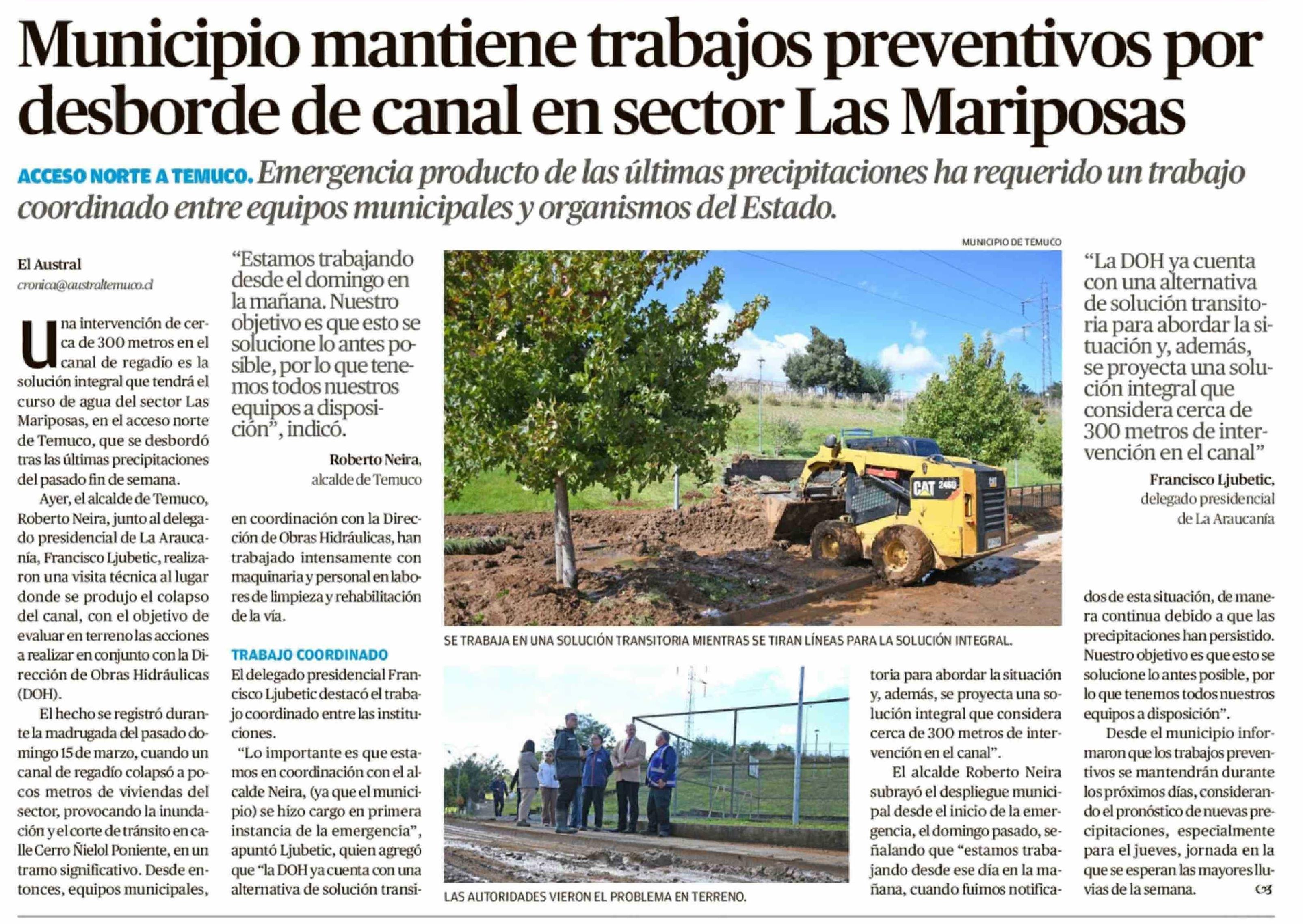 Municipio mantiene trabajos preventivos por desborde de canal en sector Las Mariposas 18-03-2026 El Austral de la Araucanía |