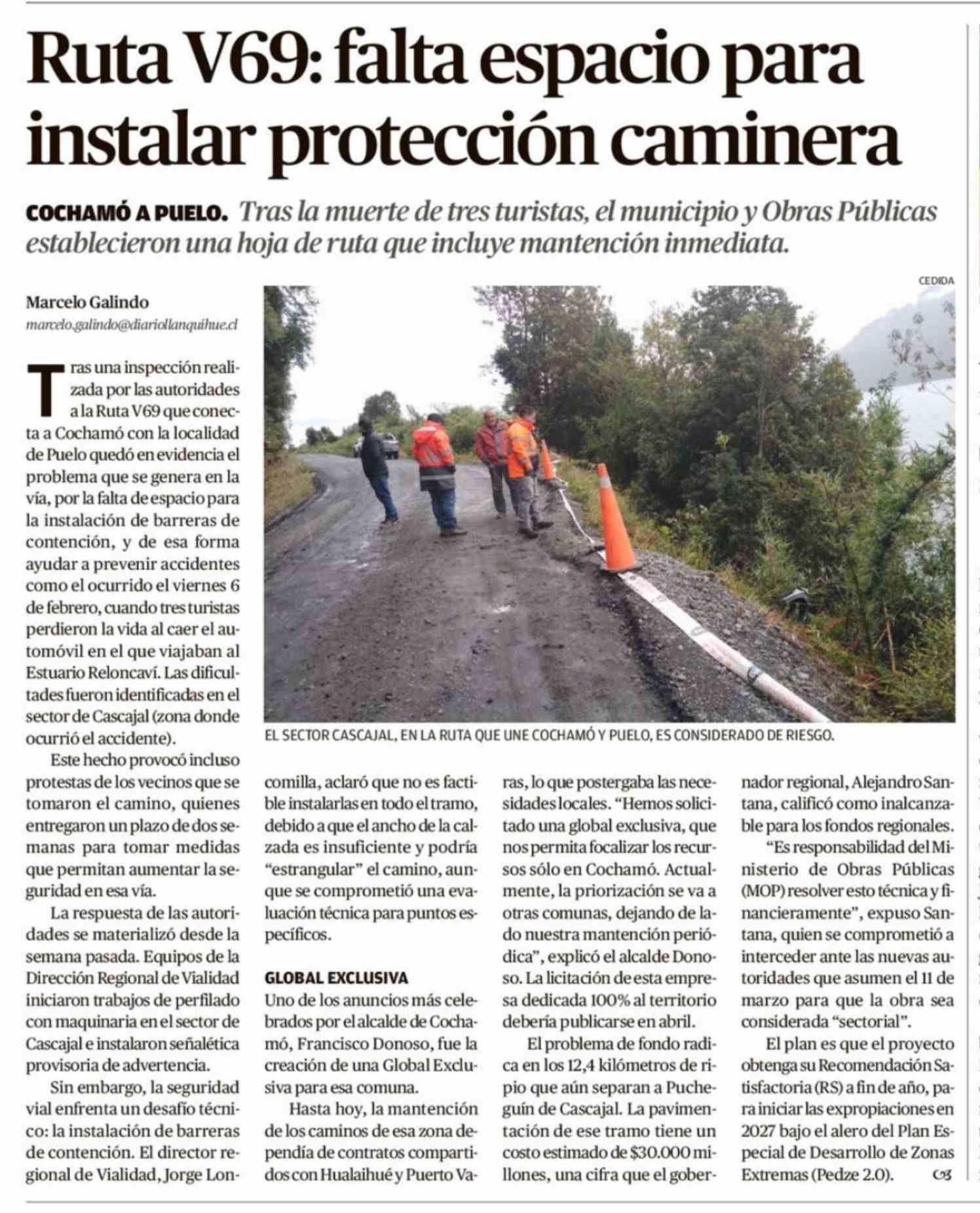 Ruta V69: falta espacio para instalar protección caminera 16-02-2026 El Llanquihue |