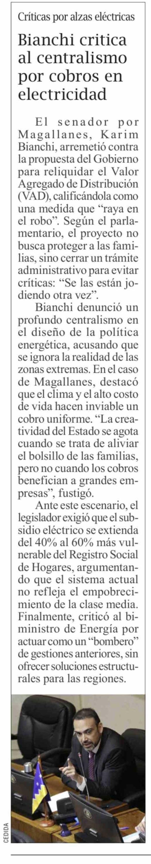 Bianchi critica al centralismo por cobros en electricidad 12-02-2026 El Pingüino |