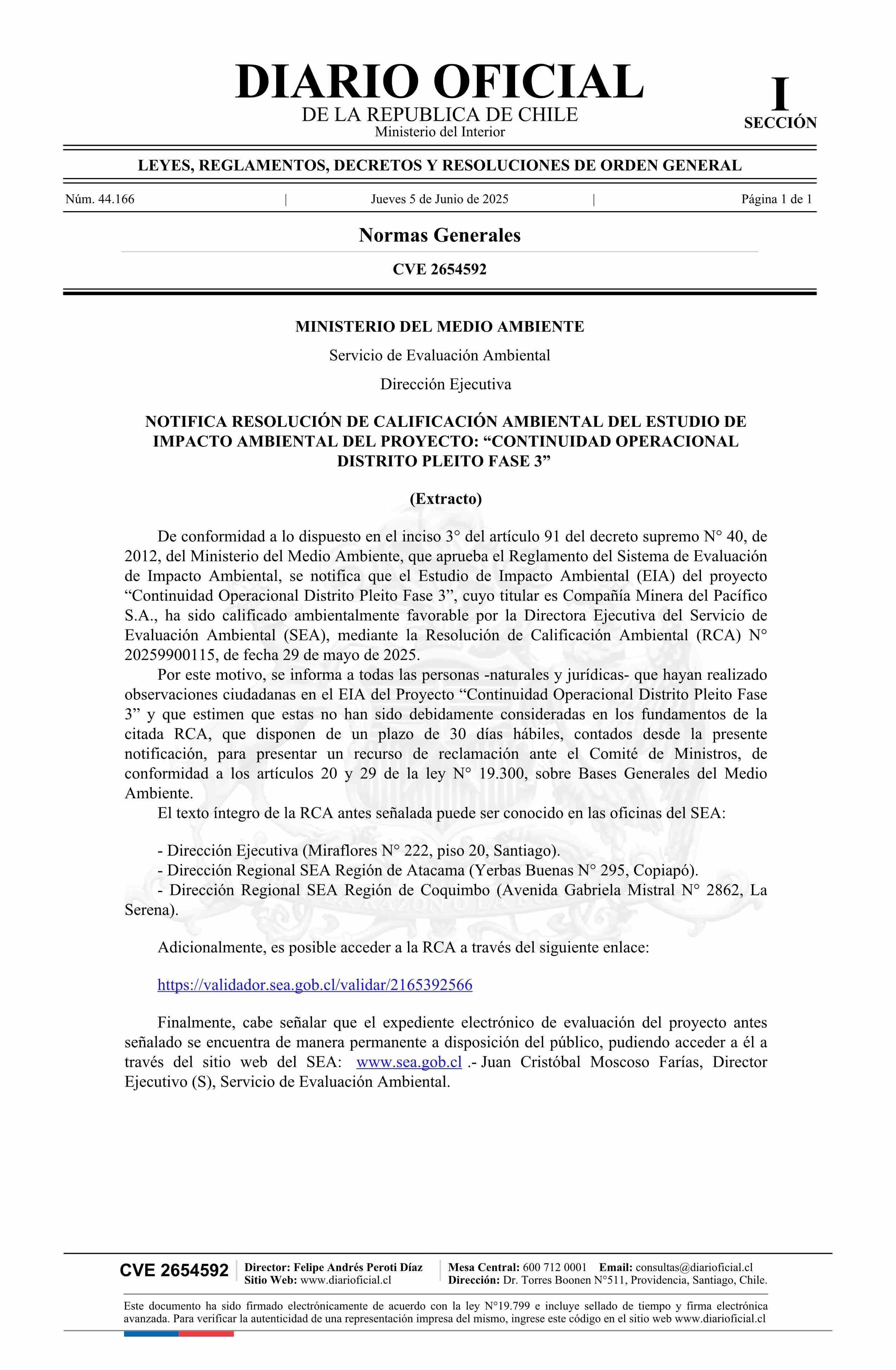 | Título: | Extracto de resolución exenta número 20259900115, de 2025.- Notifica Resolución de Calificación Ambiental del Estudio de Impacto Ambiental del proyecto Continuidad Operacional Distrito Pleito Fase 3 |
