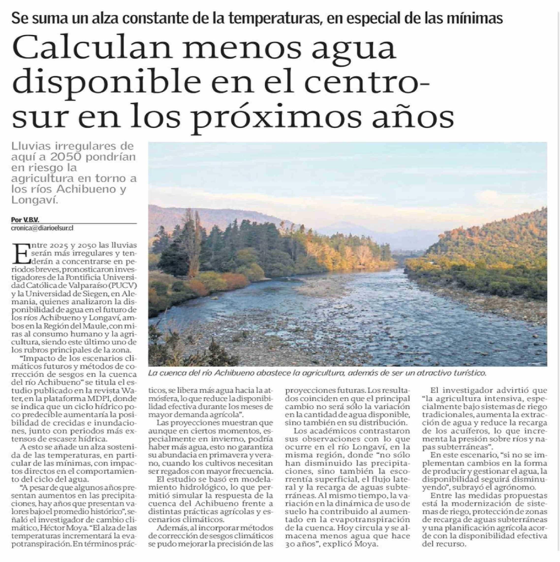 Calculan menos agua disponible en el centrosur en los próximos años 16-04-2026 El Sur |