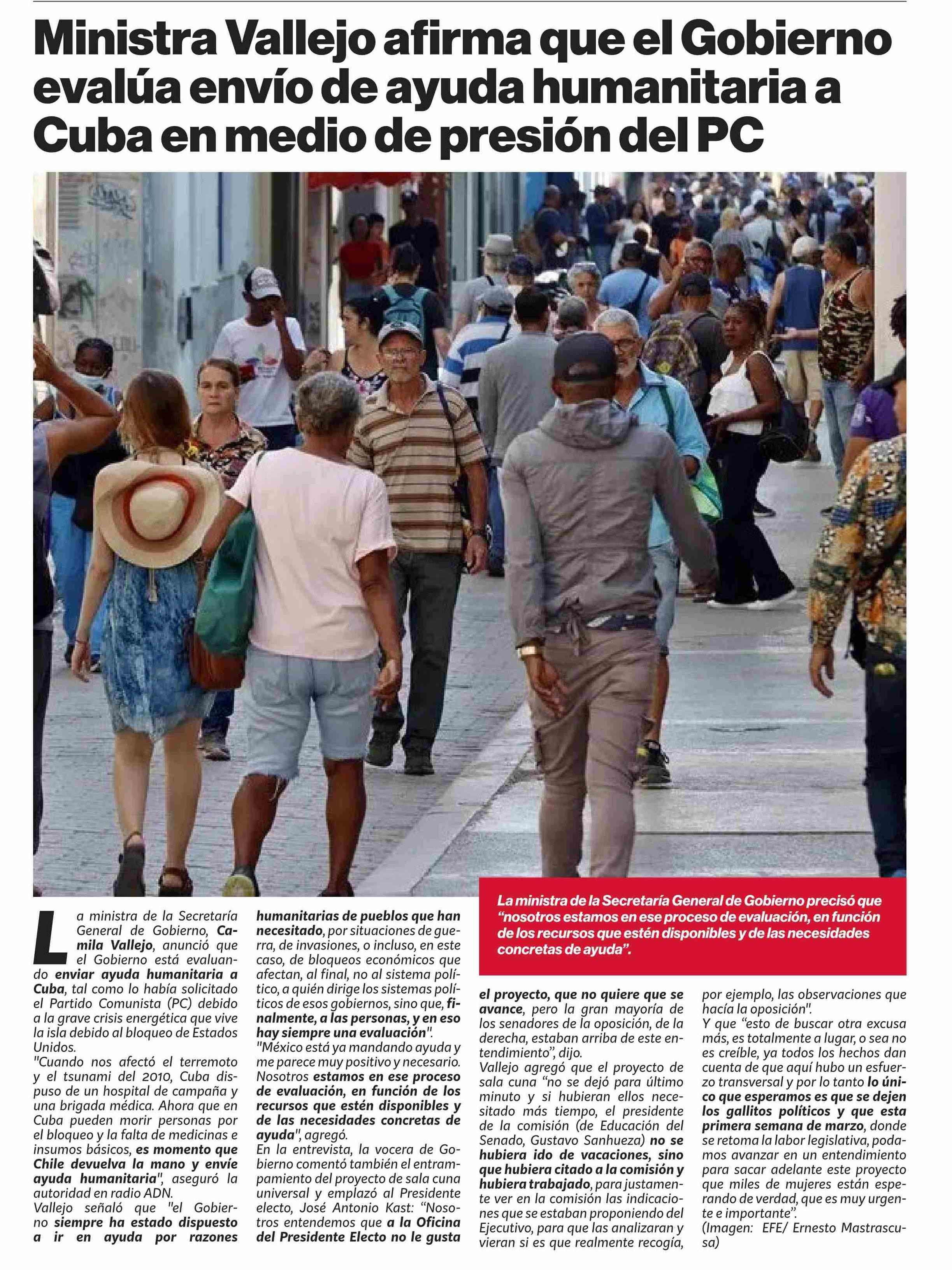 Ministra Vallejo afirma que el Gobierno evalúa envío de ayuda humanitaria a Cuba en medio de presión del PC 11-02-2026 Puranoticia.cl |