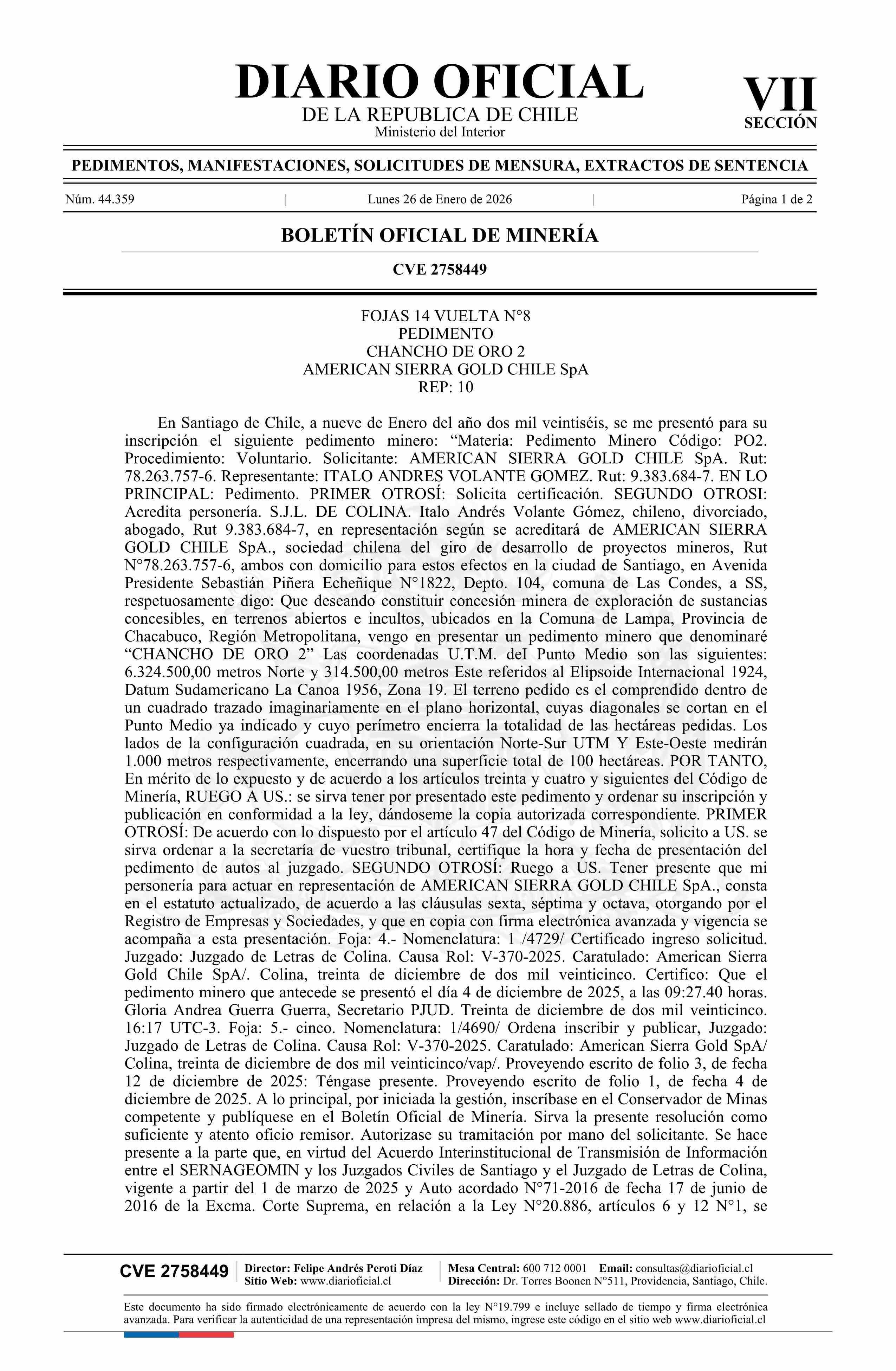 CHANCHO DE ORO 2 / American Sierra Gold Chile SpA 26-01-2026 DIARIO OFICIAL CHILE - BOLETÍN OFICIAL DE MINERÍA |