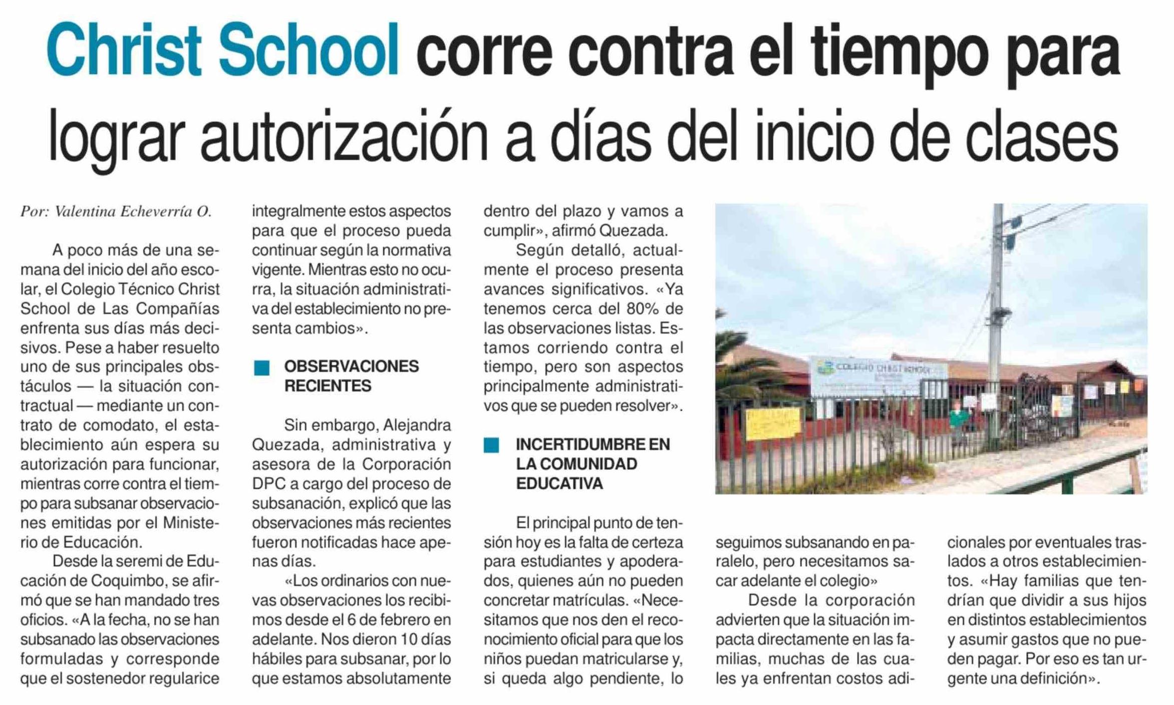 Christ School corre contra el tiempo para lograr autorización a días del inicio de clases 17-02-2026 Diario la Región |