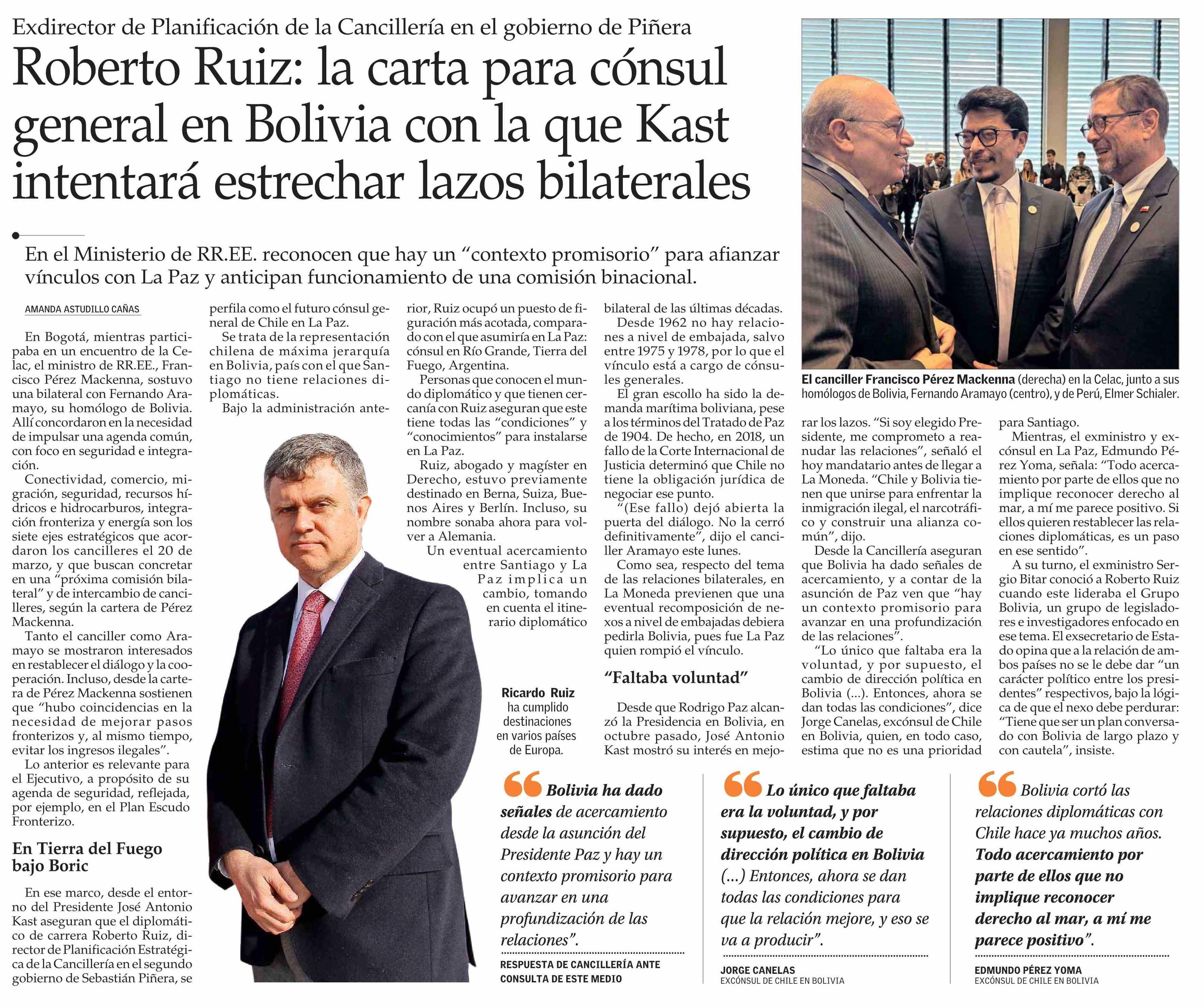 Roberto Ruiz: la carta para cónsul general en Bolivia con la que Kast intentará estrechar lazos bilaterales 24-03-2026 El Mercurio |