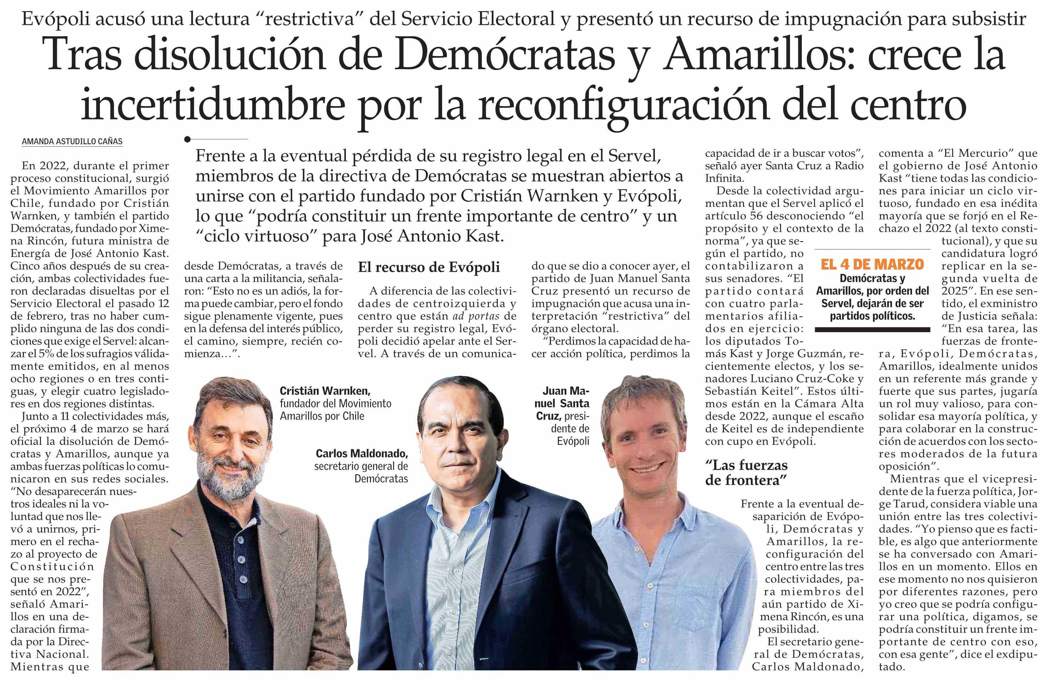Tras disolución de Demócratas y Amarillos: crece la incertidumbre por la reconfiguración del centro 17-02-2026 El Mercurio |