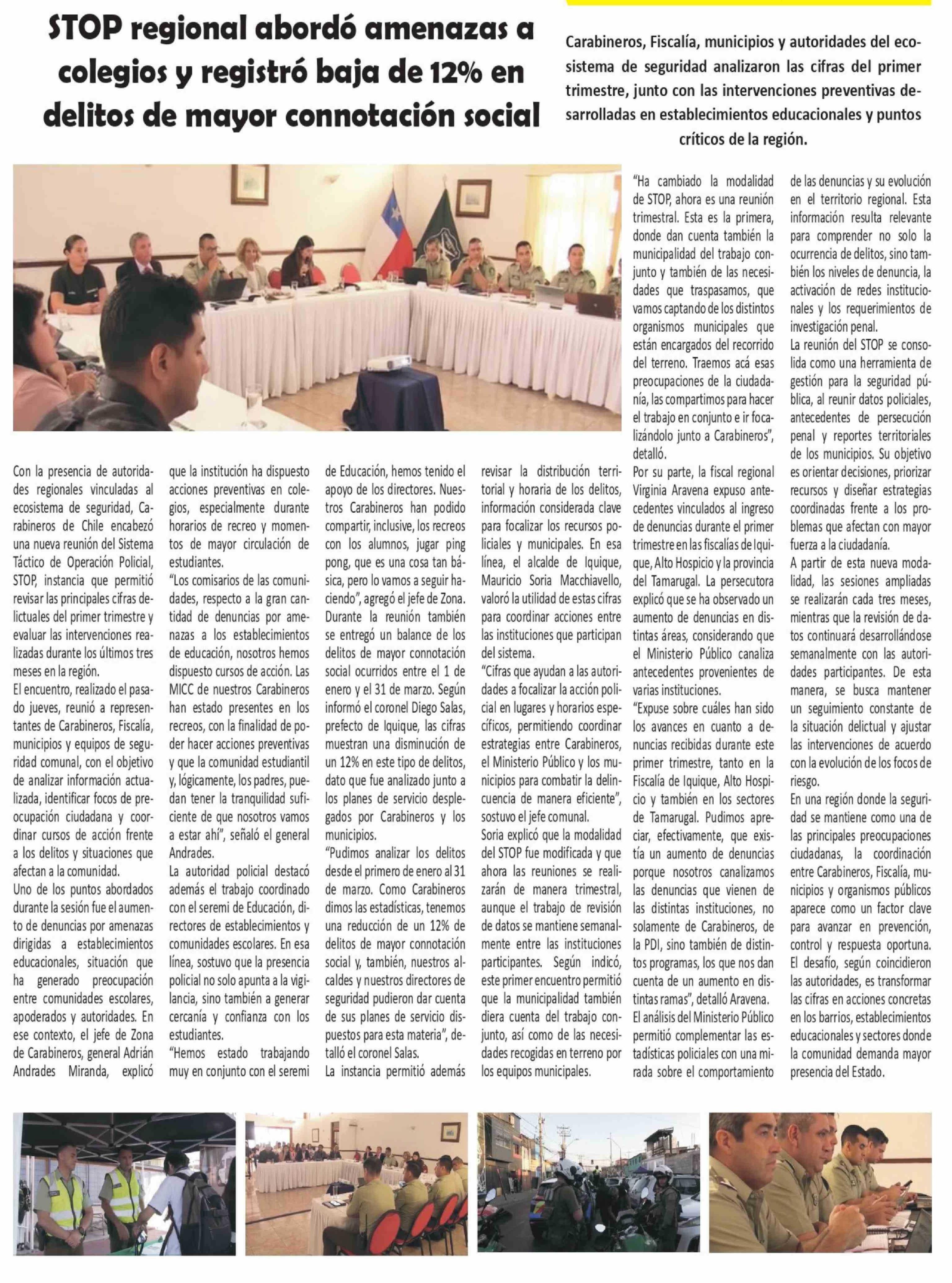 | Título: | STOP regional abordó amenazas a colegios y registró baja de 12% en delitos de mayor connotación social |