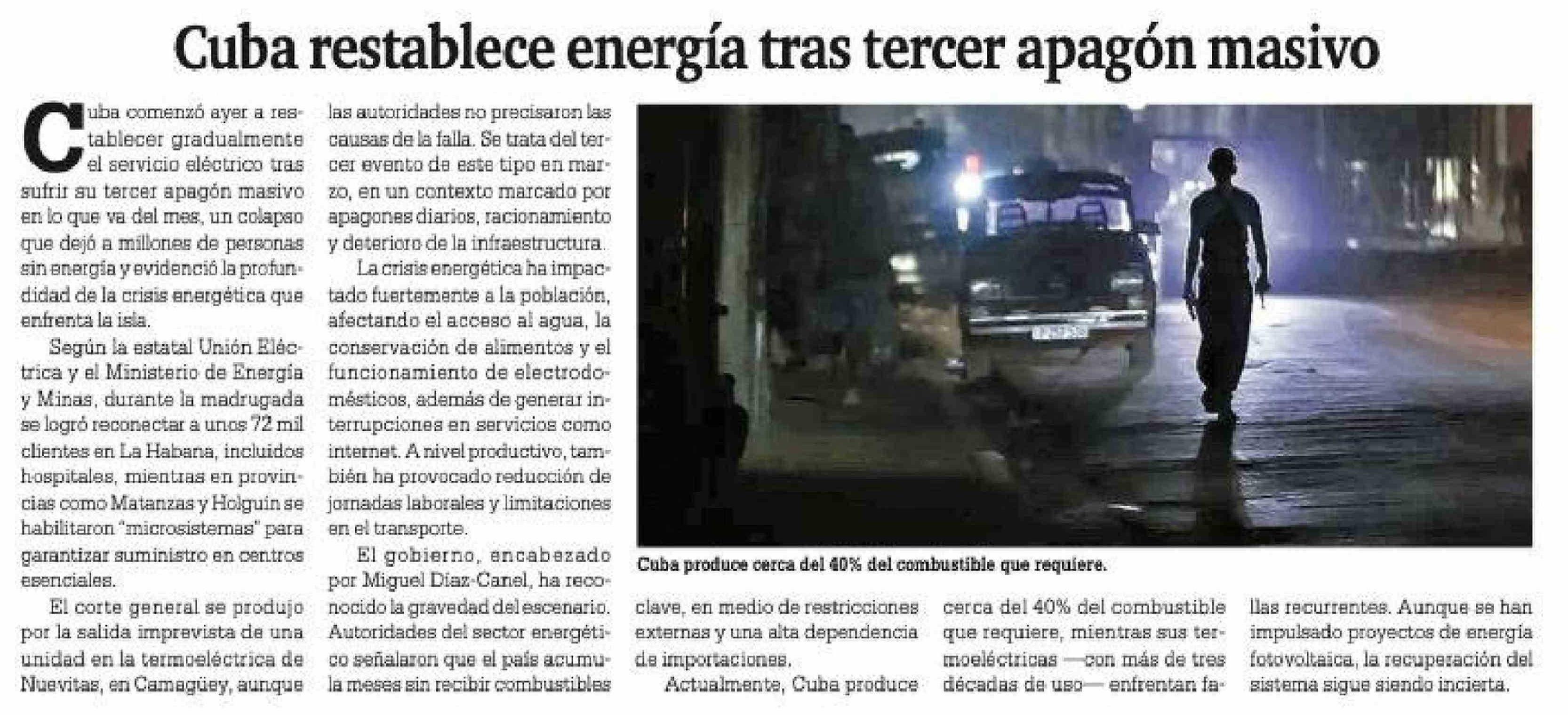 Título: Cuba restablece energía tras tercer apagón masivo