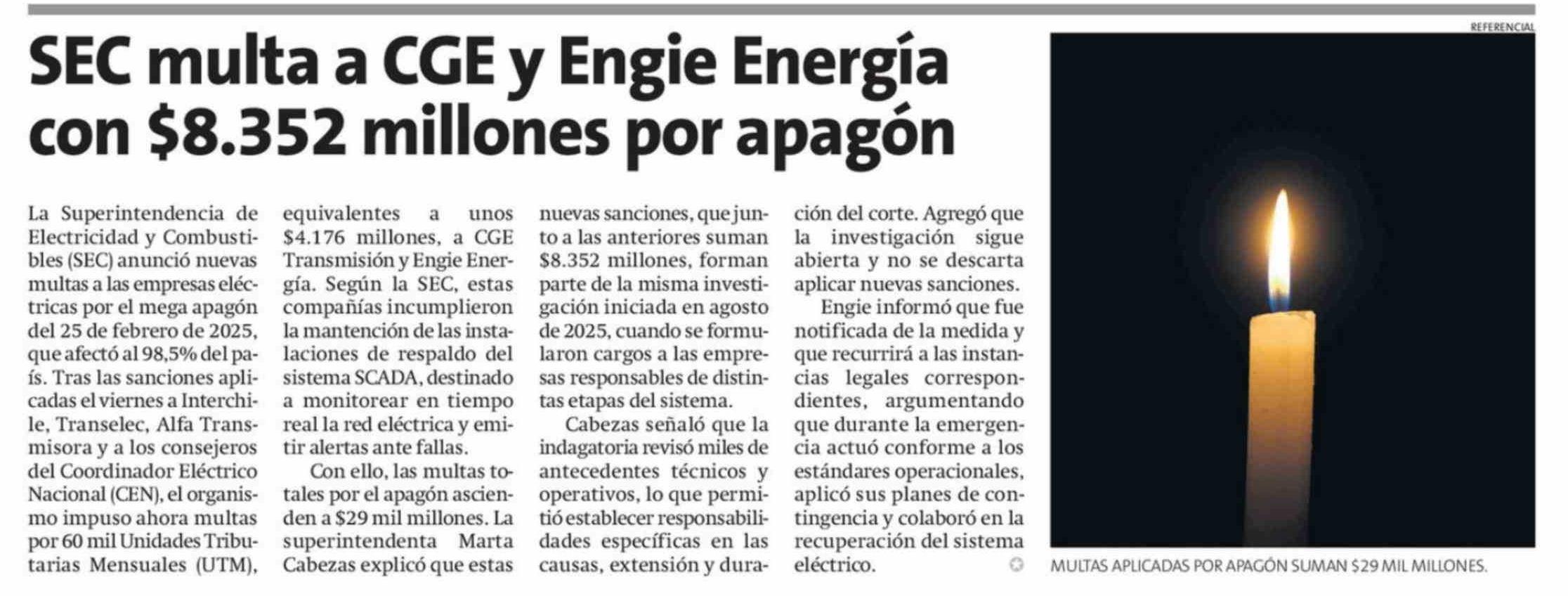 SEC multa a CGE y Engie Energía con $8.352 millones por apagón 25-02-2026 La Estrella de Iquique |