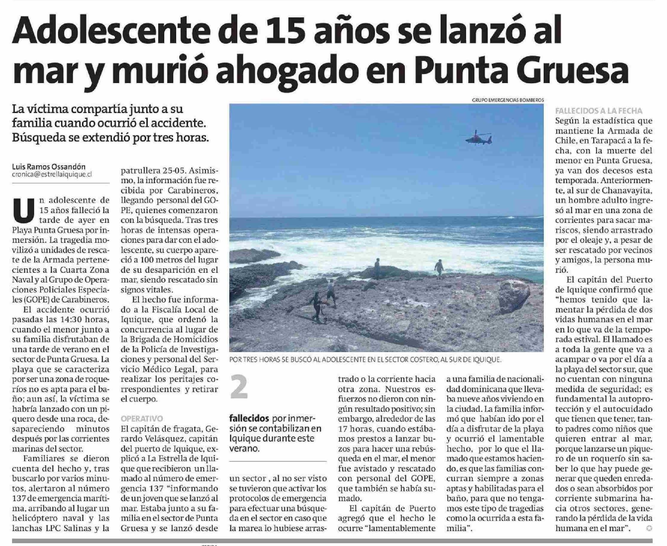 Adolescente de 15 años se lanzó al mar y murió ahogado en Punta Gruesa 25-01-2026 La Estrella de Iquique |