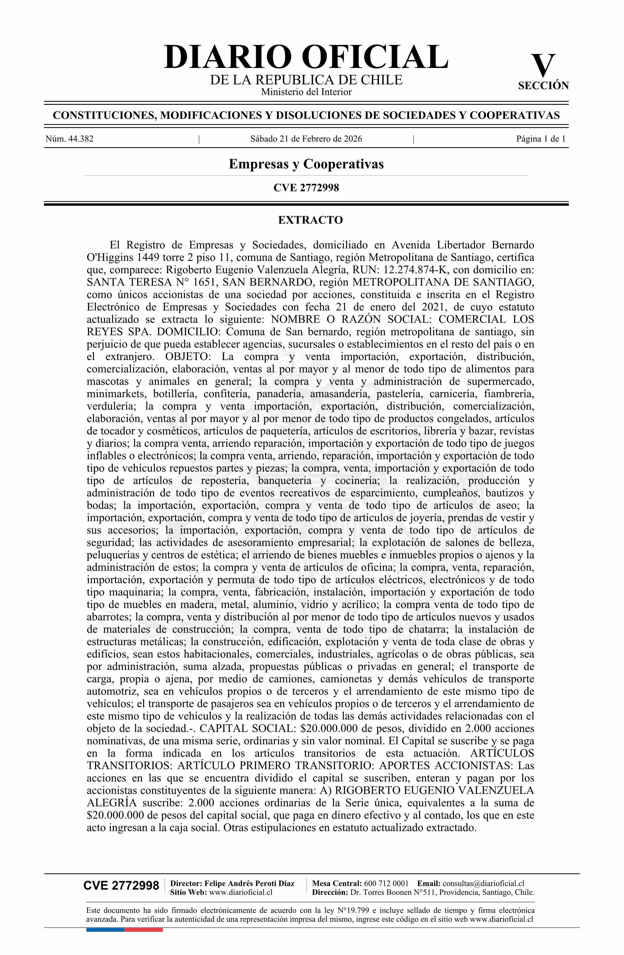 COMERCIAL LOS REYES SPA 77.295.796-3 21-02-2026 Diario Oficial Edición Electrónica |