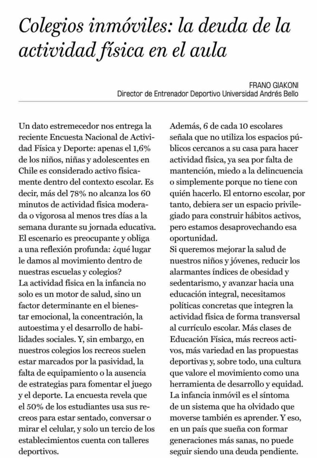 CARTAS: Colegios inmóviles: la deuda de la actividad física en el aula 20-05-2025 La Prensa de Curicó |
