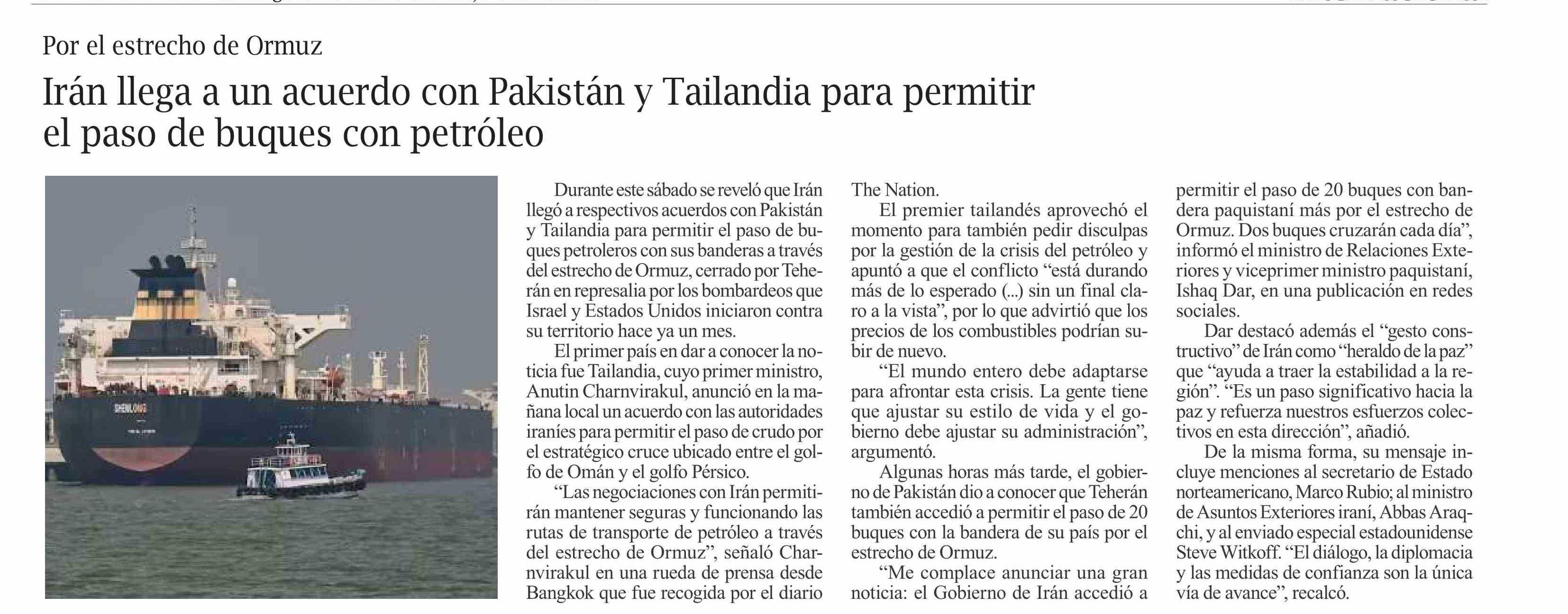 | Título: | Irán llega a un acuerdo con Pakistán y Tailandia para permitir el paso de buques con petróleo |