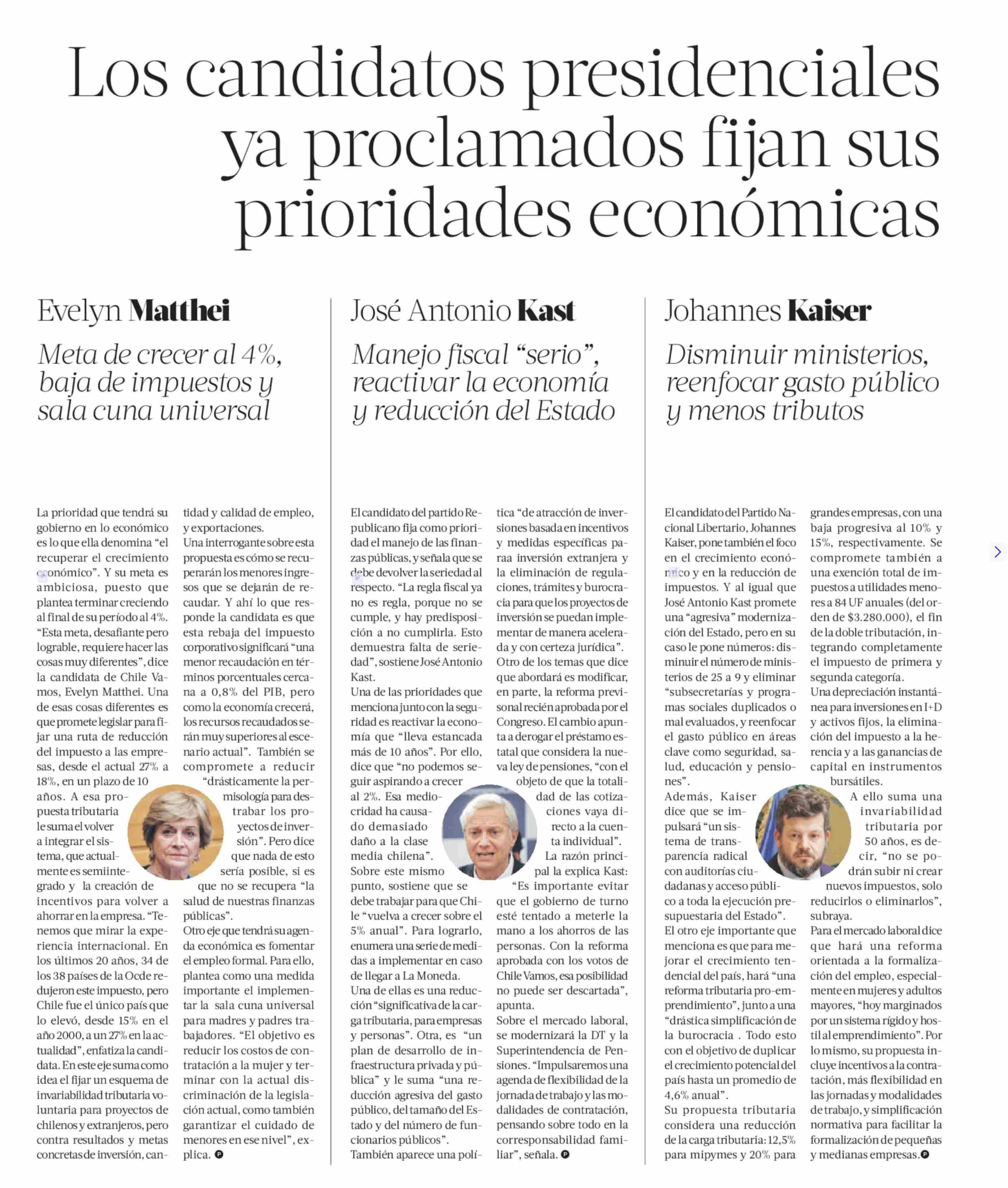 Los candidatos presidenciales va proclamados fijan sus prioridades económicas 26-04-2025 La Tercera |
