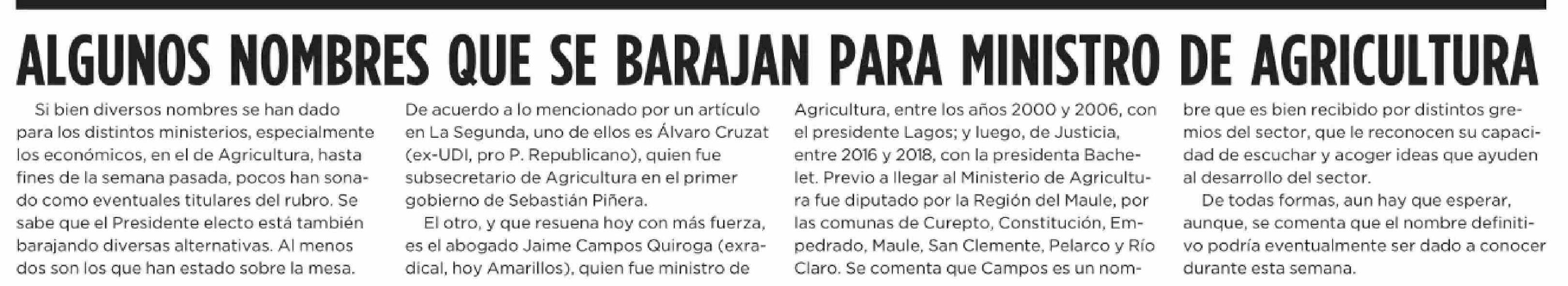 Título: ALGUNOS NOMBRES QUE SE BARAJAN PARA MINISTRO DE AGRICULTURA Si bien diversos nombres se han dado De acuerdo a lo mencionado por un artículo Agricultura, entre los años 2000 y 2006, con bre que es bien recibido por distintos gre-