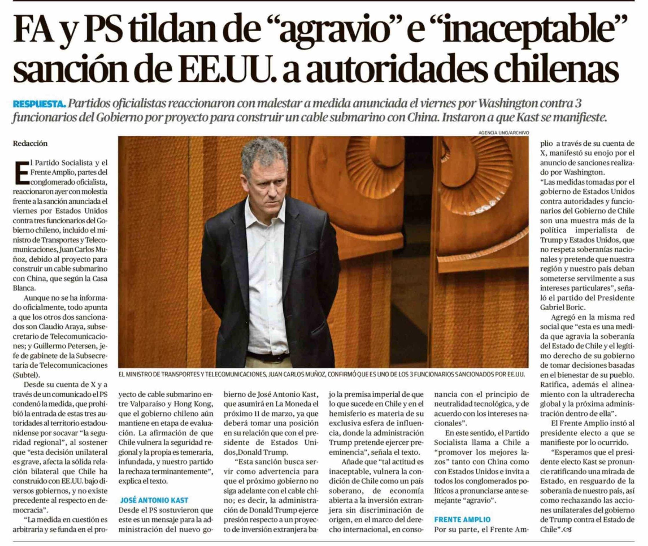 | Título: | FA y PS tildan de "agravio" e "inaceptable" sanción de EE.UU. a autoridades chilenas |