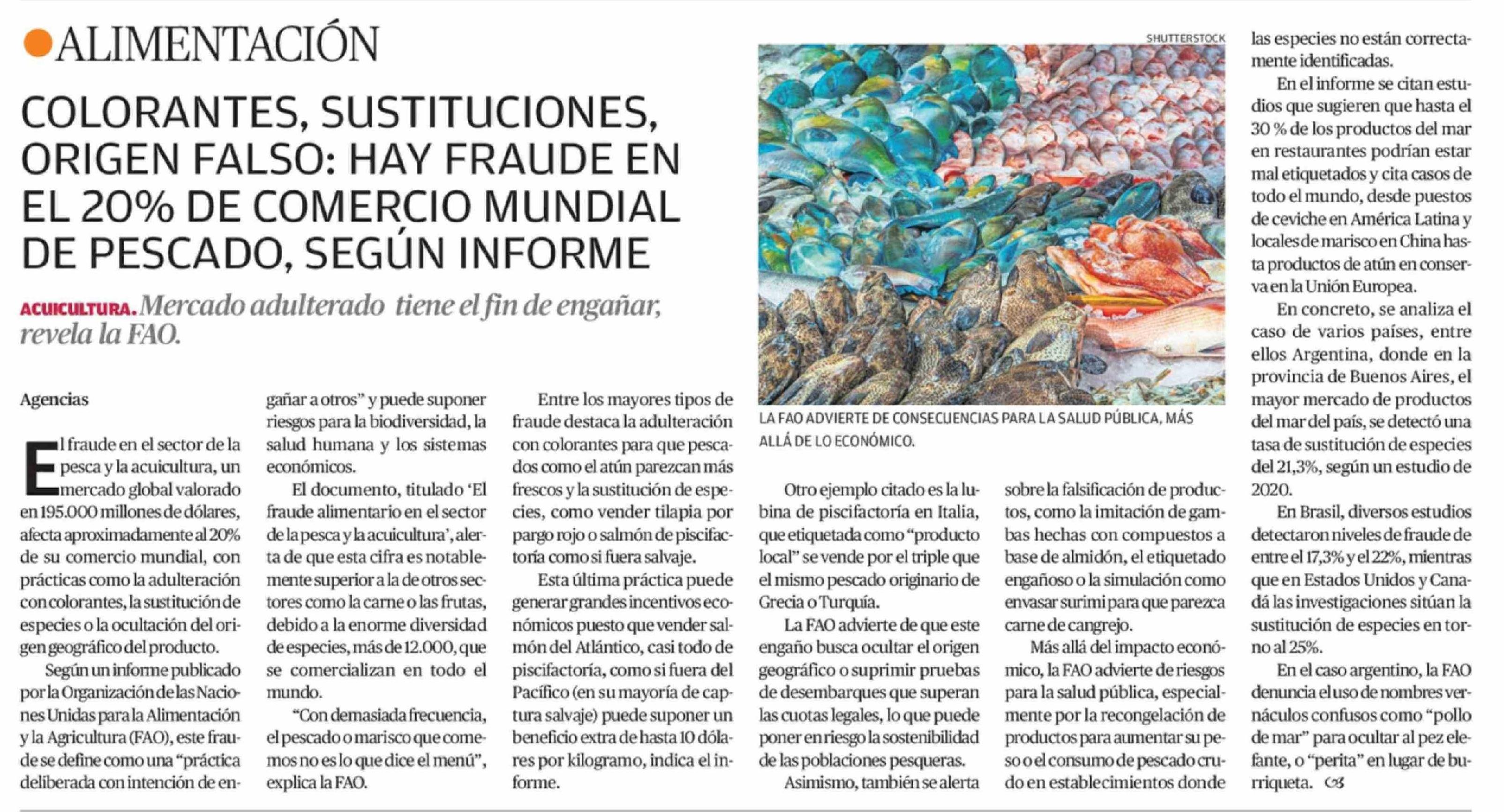 COLORANTES, SUSTITUCIONES, ORIGEN FALSO: HAY FRAUDE EN EL 20% DE COMERCIO MUNDIAL DE PESCADO, SEGÚN INFORME 14-02-2026 El Mercurio de Antofagasta |
