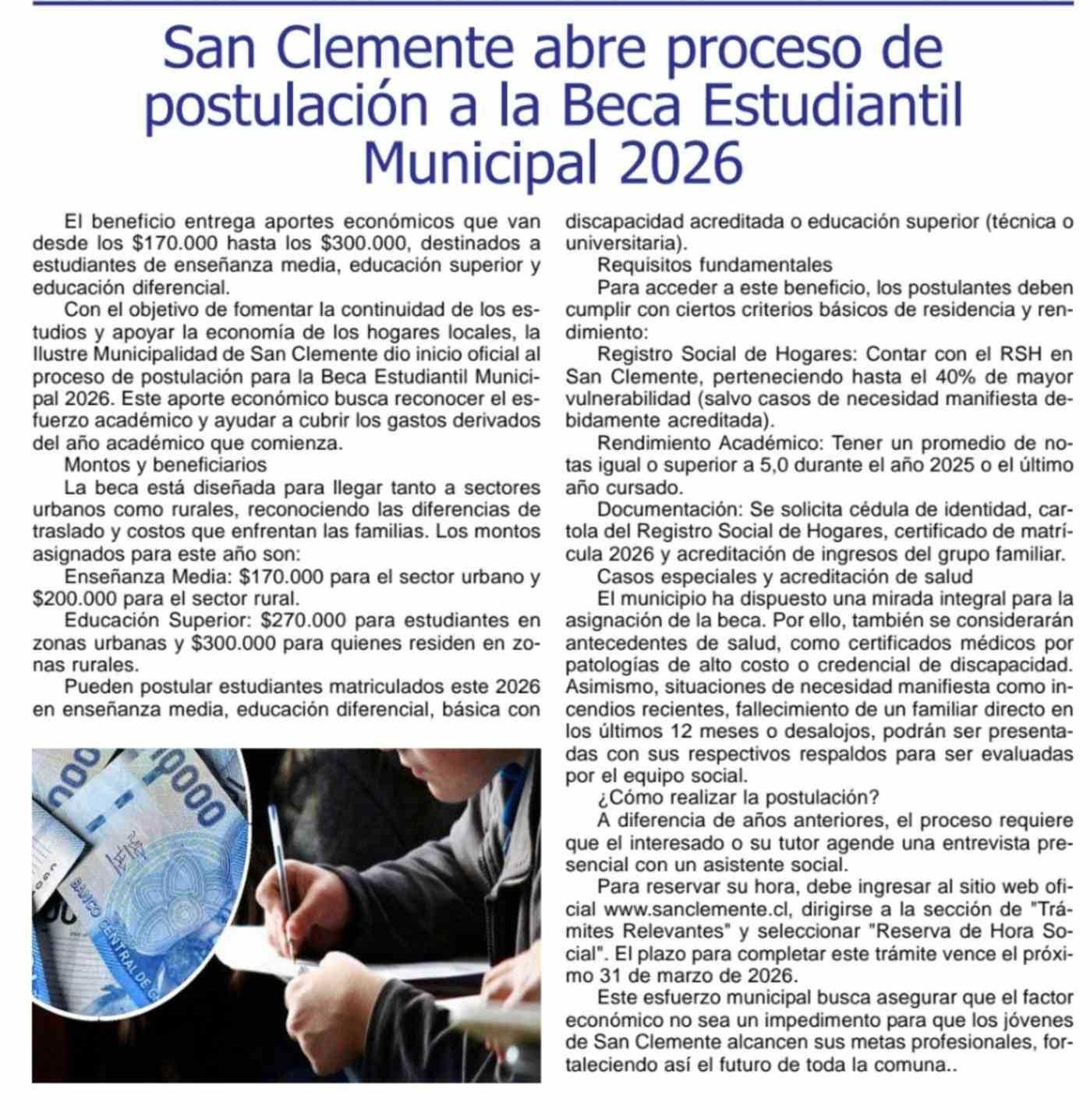 Título: San Clemente abre proceso de postulación a la Beca Estudiantil Municipal 2026