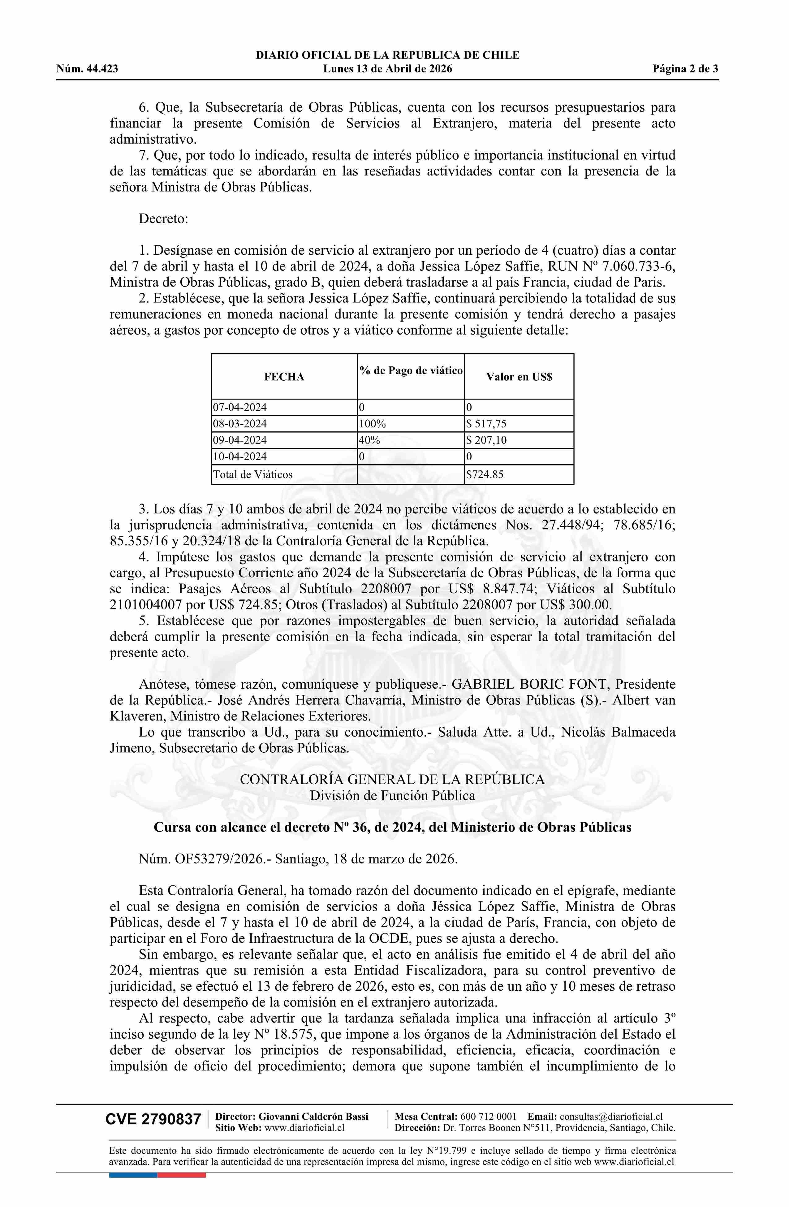 Título: Decreto número 36, de 2024.- Designa en comisión de servicio al extranjero a doña Jessica López Saffie, Ministra de Obras Públicas, a la ciudad de París, Francia
