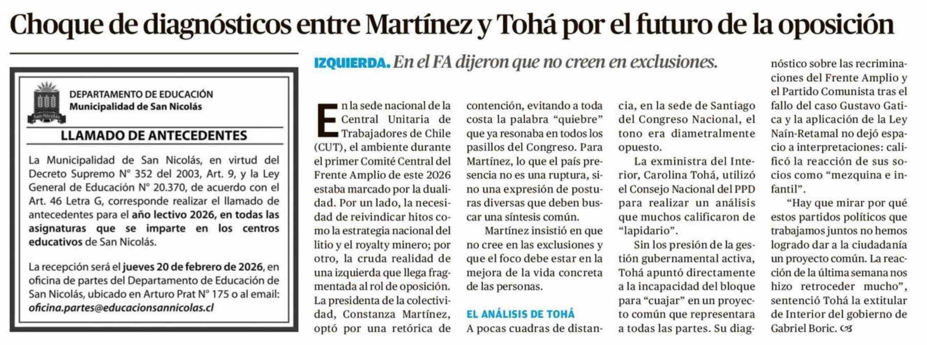 Título: Choque de diagnósticos entre Martínez y Tohá por el futuro de la oposición
