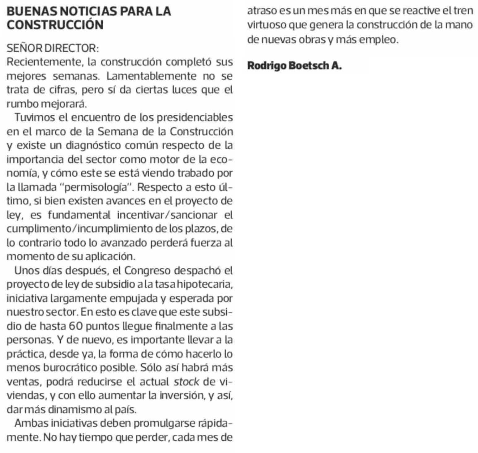 | Título: | CARTAS: BUENAS NOTICIAS PARA LA CONSTRUCCIÓN |