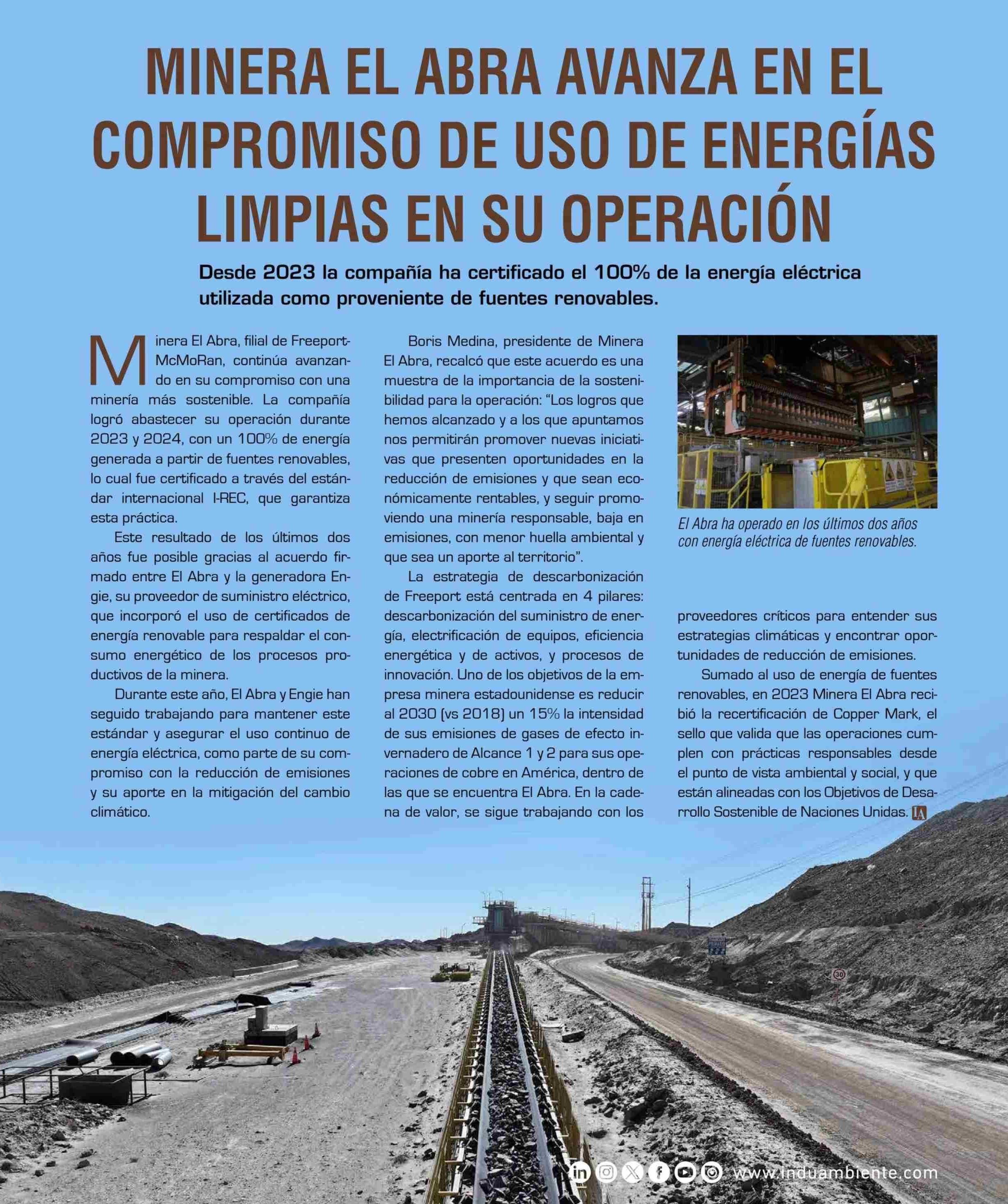 MINERA EL ABRA AVANZA EN EL COMPROMISO DE USO DE ENERGÍAS LIMPIAS EN SU OPERACIÓN 08-01-2026 Revista Induambiente |