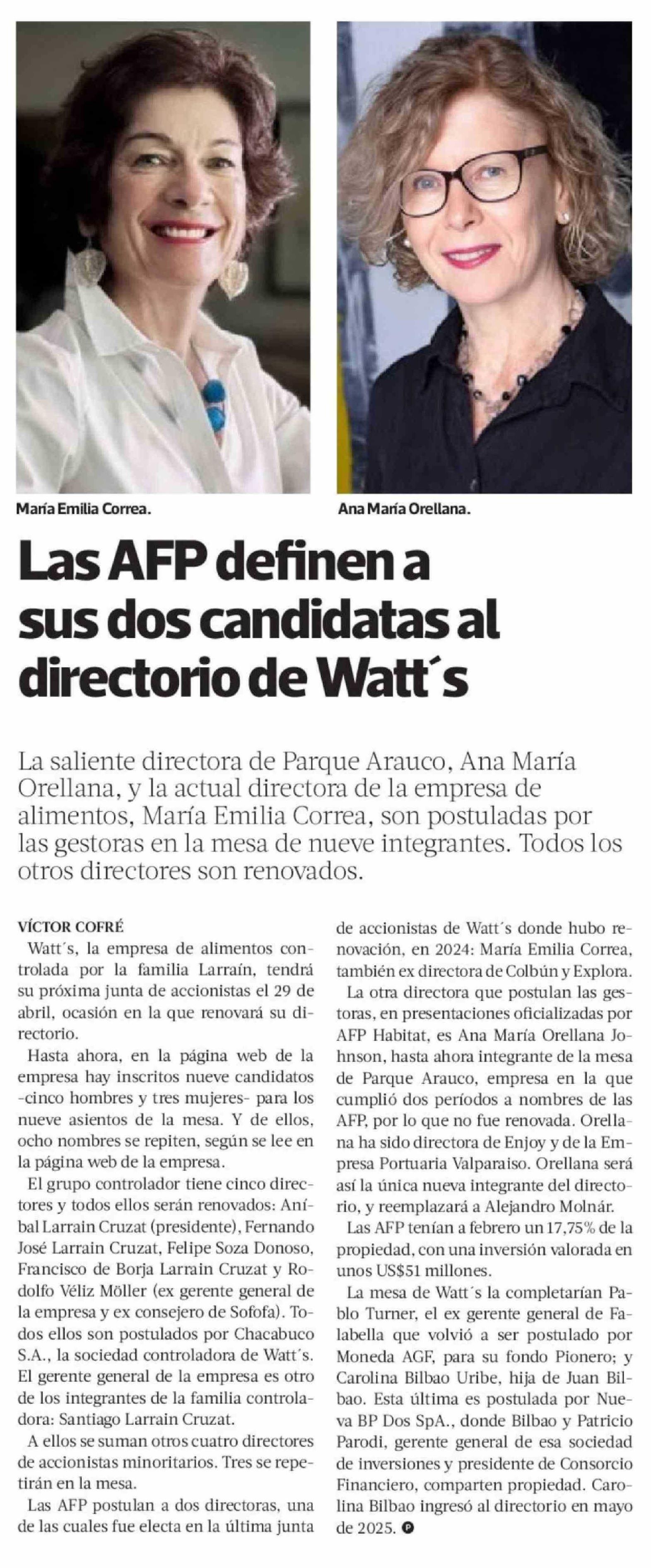 Las AFP definen a sus dos candidatas al directorio de Watt's 10-04-2026 La Tercera |