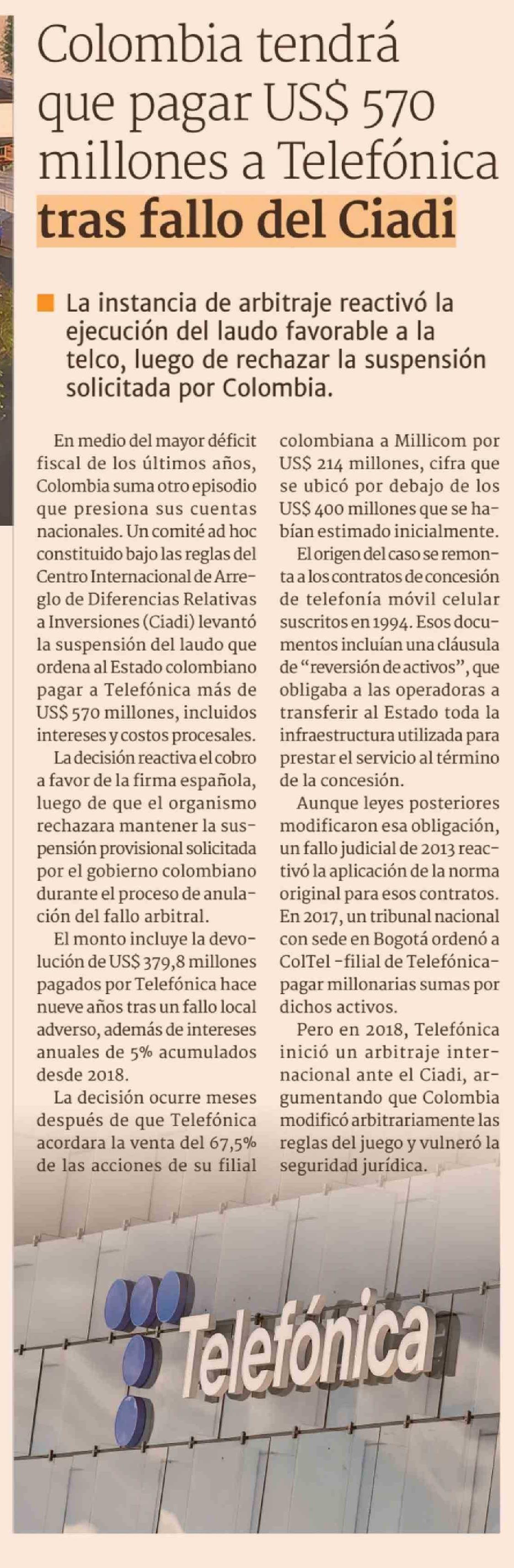 Colombia tendrá que pagar US$ 570 millones a Telefónica tras fallo del Ciadi 24-04-2026 Diario Financiero |