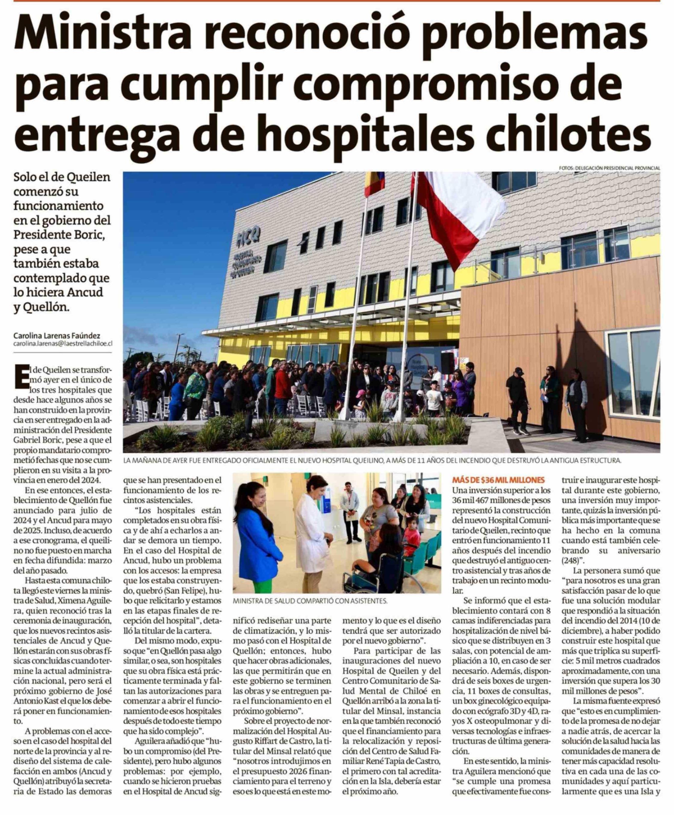 Ministra reconoció problemas para cumplir compromiso de entrega de hospitales chilotes 21-02-2026 La Estrella de Chiloé |