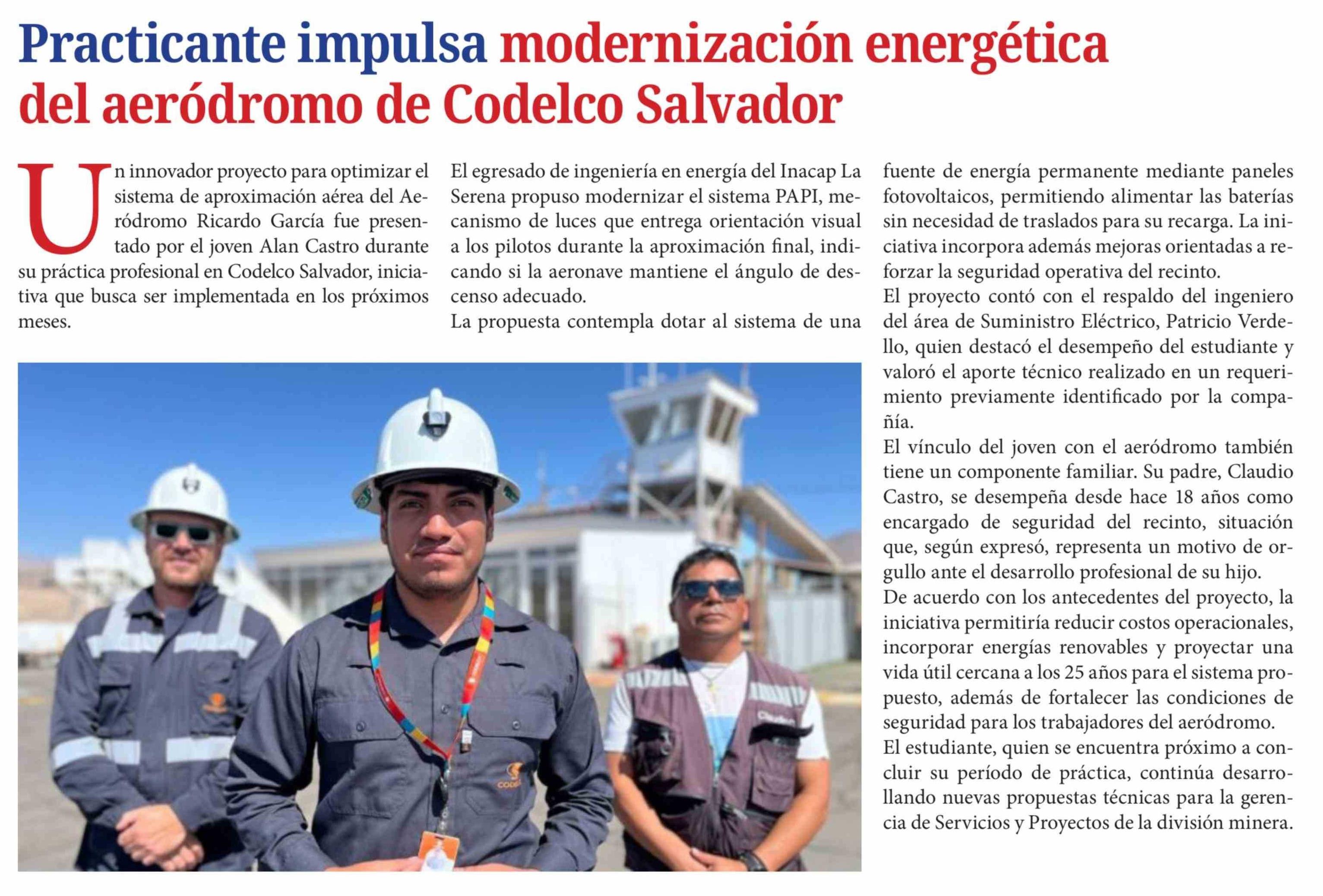 Título: Practicante impulsa modernización energética del aeródromo de Codelco Salvador