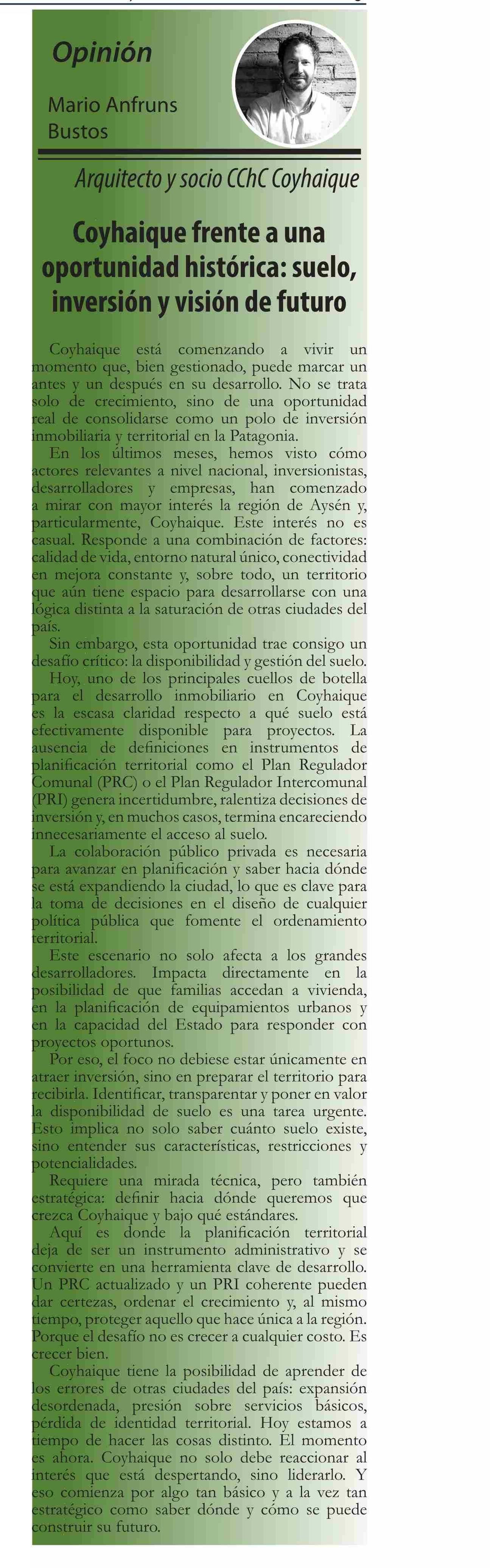 | Título: | COLUMNAS DE OPINIÓN: Coyhaique frente a una oportunidad histórica, suelo, inversión y visión de futuro |