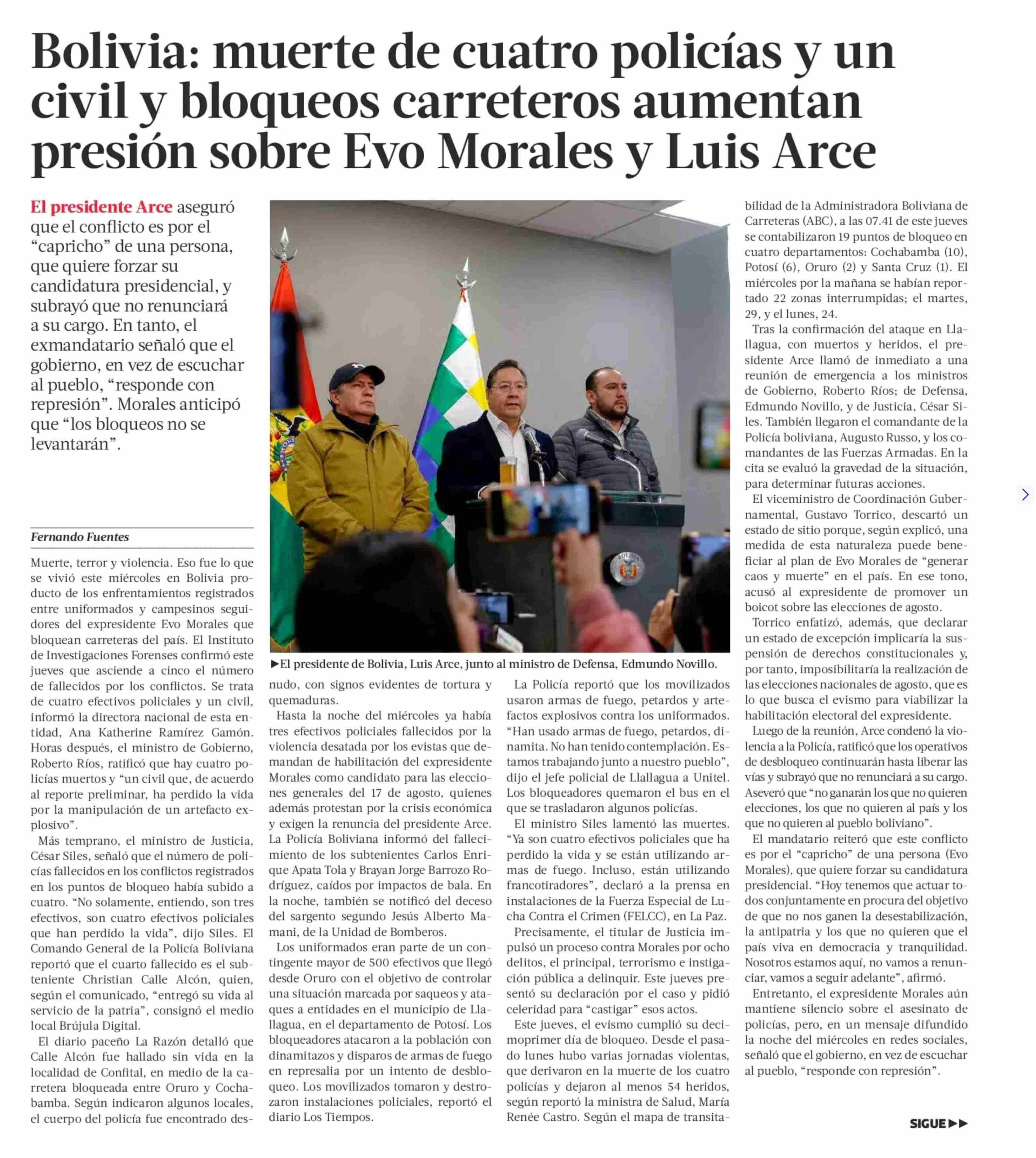 | Título: | Bolivia: muerte de cuatro policías y un civil y bloqueos carreteros aumentan presión sobre Evo Morales y Luis Arce |
