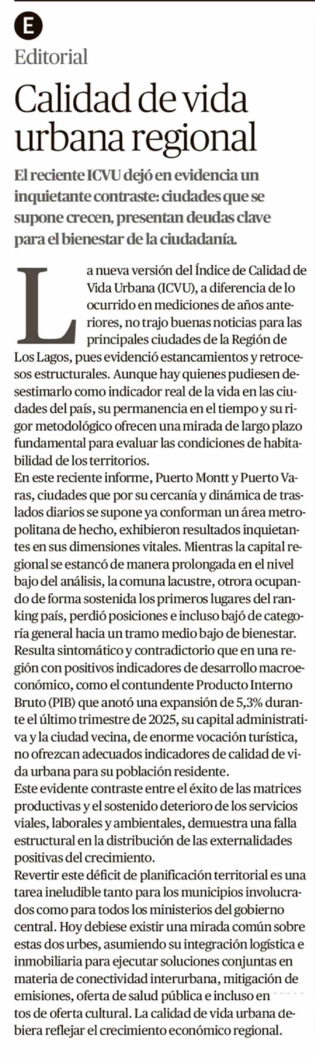Editorial: Calidad de vida urbana regional 29-04-2026 El Austral de Osorno |