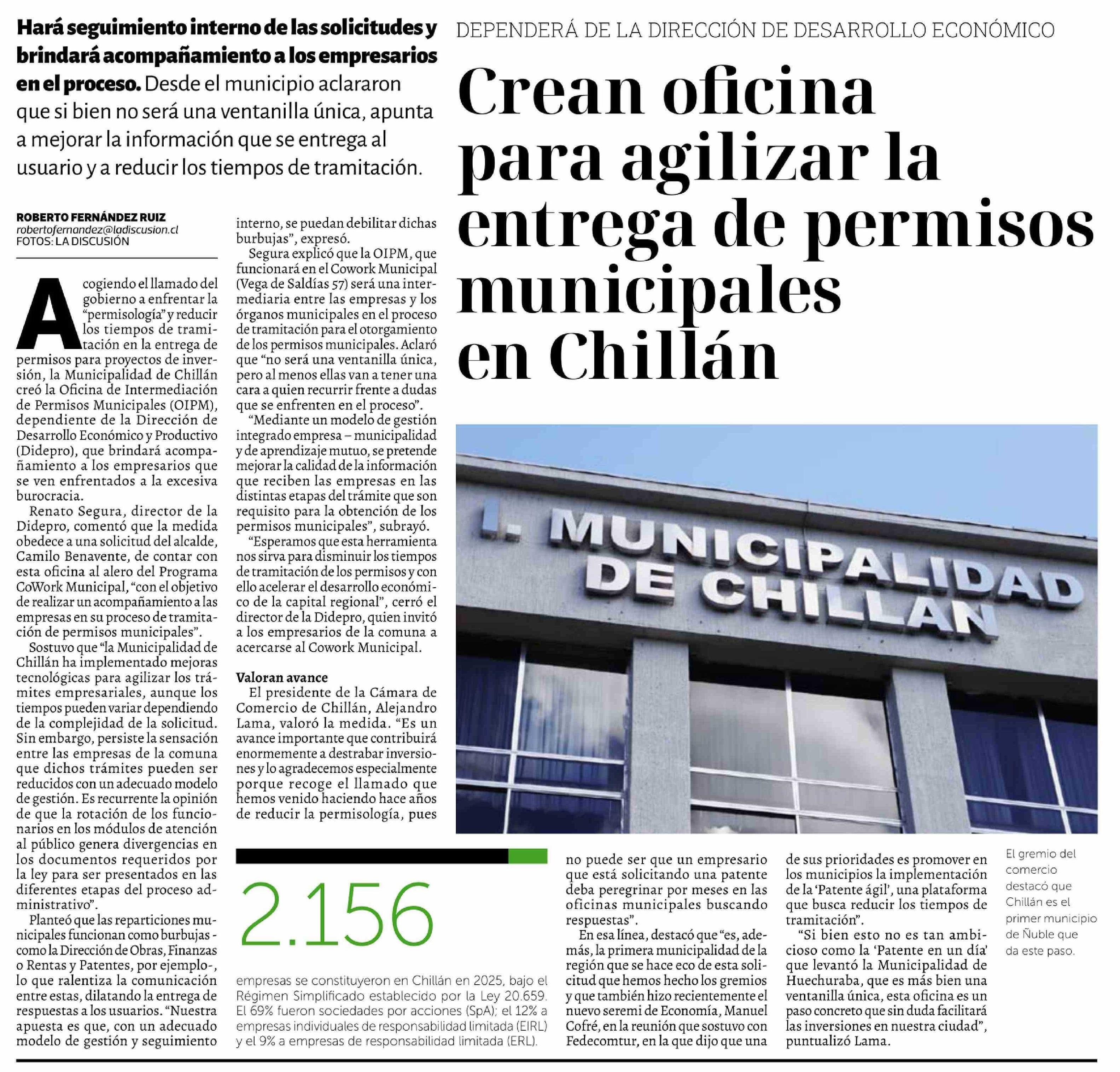 Crean oficina para agilizar la entrega de permisos municipales en Chillán 08-04-2026 La Discusión |