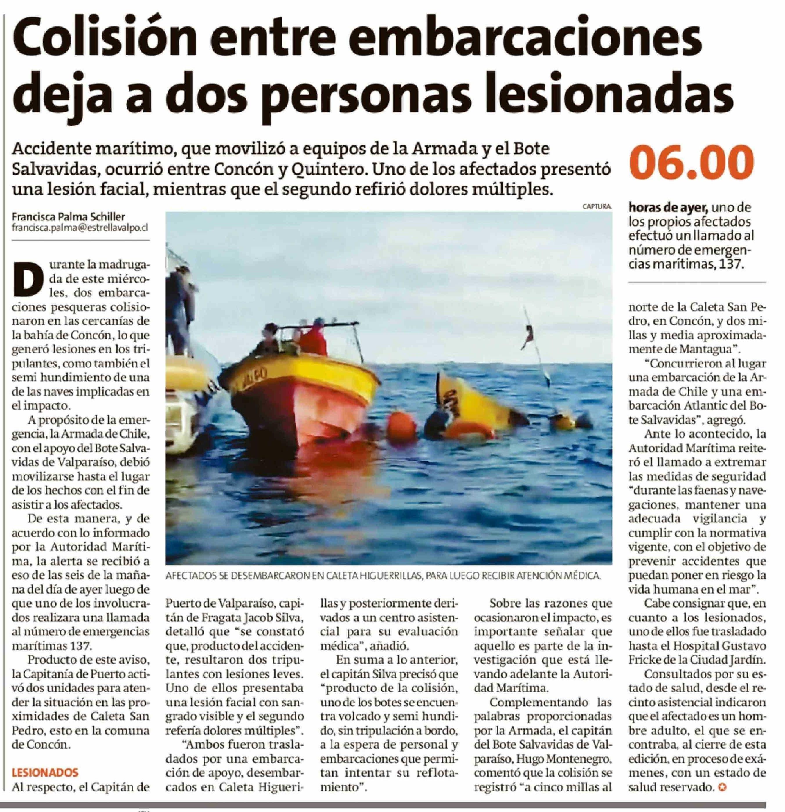 Colisión entre embarcaciones deja a dos personas lesionadas 05-02-2026 La Estrella de Valparaíso |