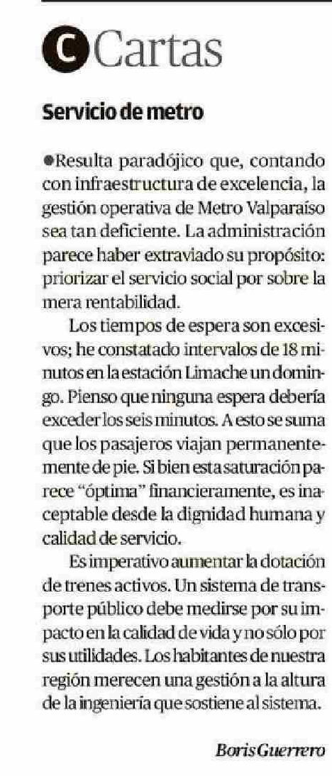 CARTAS: Servicio de metro 24-01-2026 El Mercurio de Valparaíso |