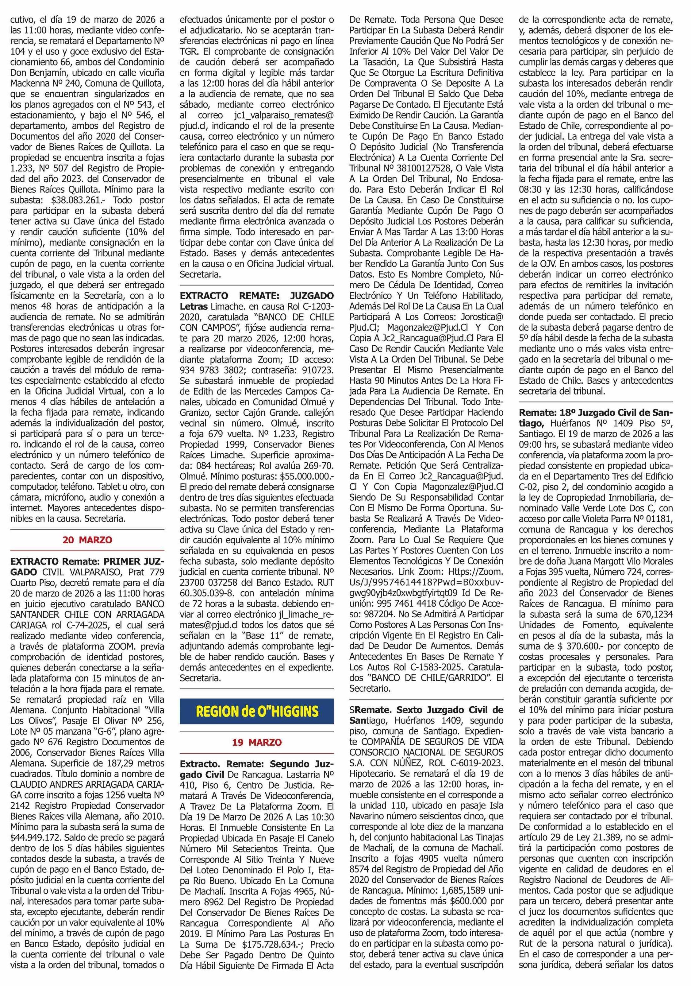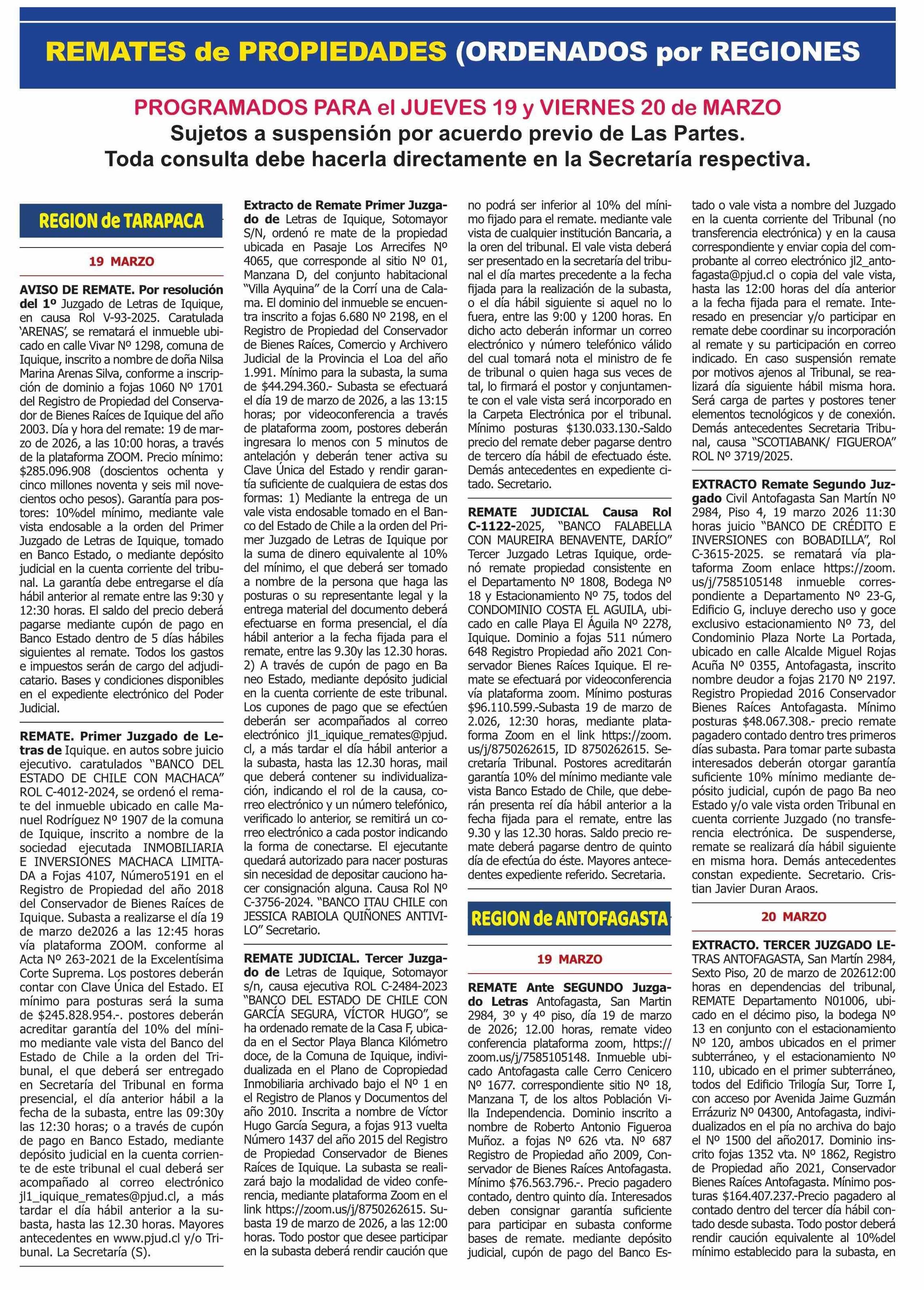 REMATES: REMATES de PROPIEDADES (ORDENADOS por REGIONES 13-03-2026 P&L Públicos y Legales |