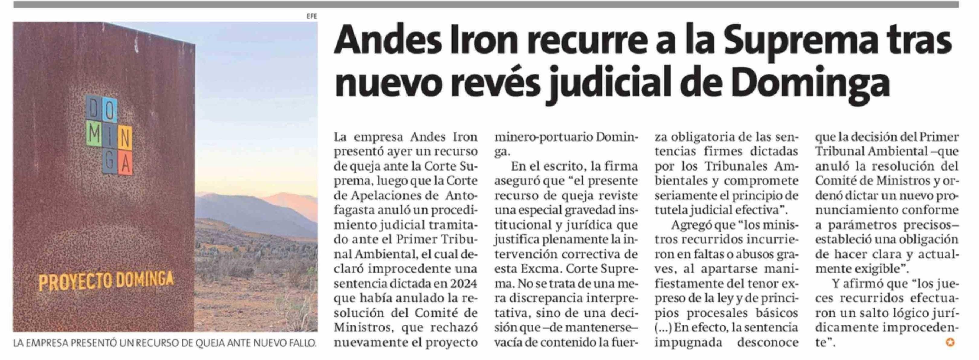 Título: Andes Iron recurre a la Suprema tras nuevo revés judicial de Dominga