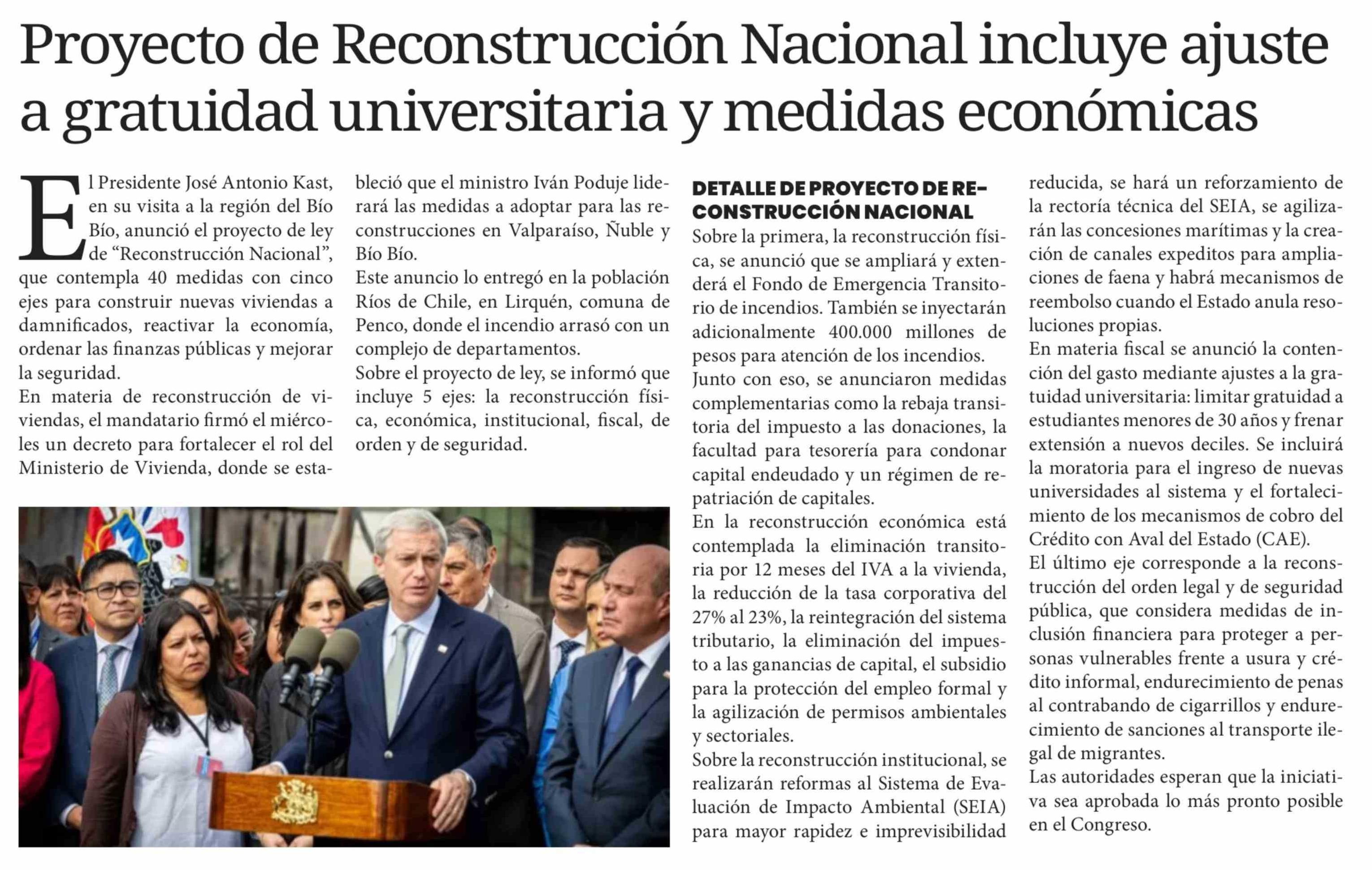Título: Proyecto de Reconstrucción Nacional incluye ajuste a gratuidad universitaria y medidas económicas