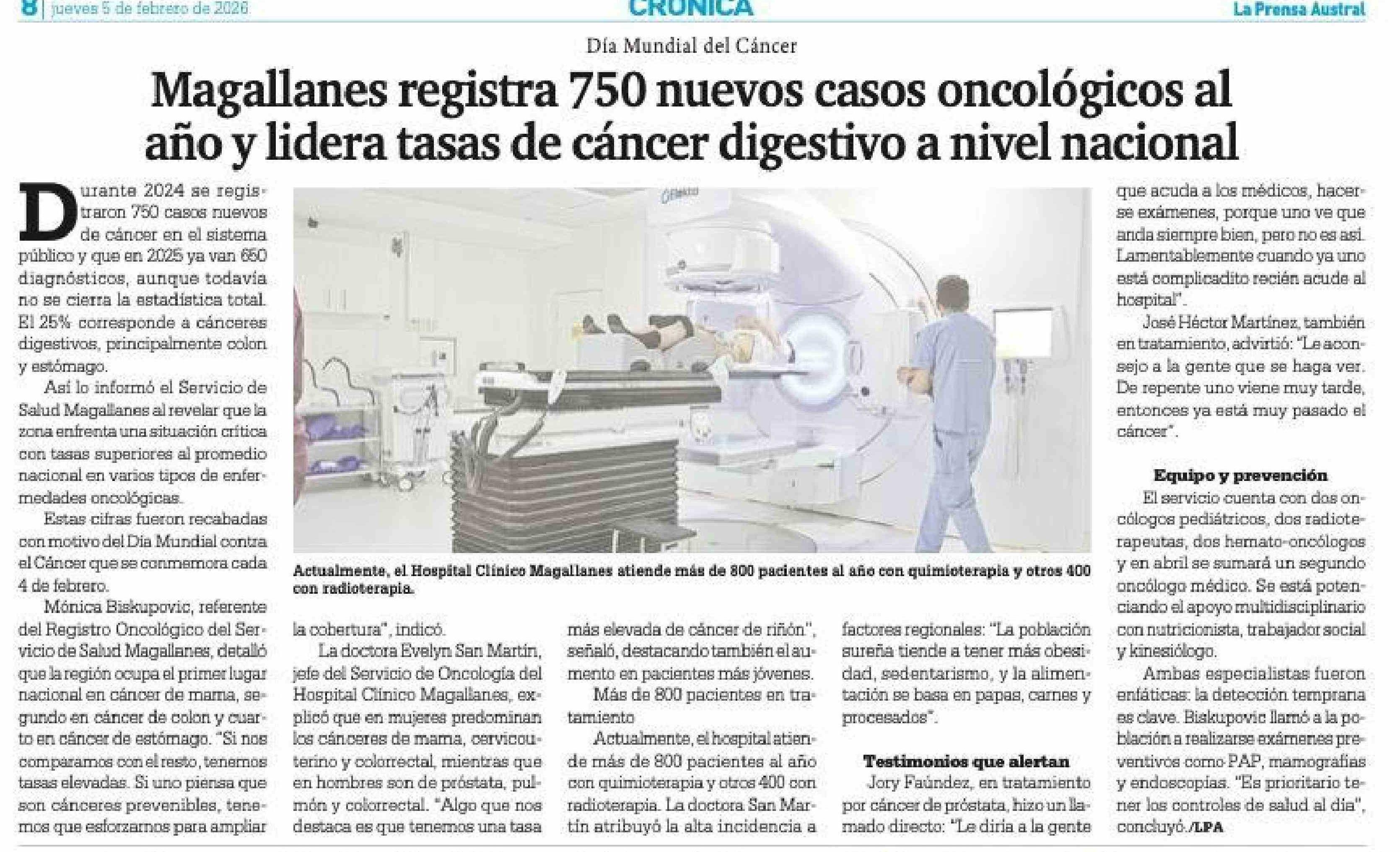 Magallanes registra 750 nuevos casos oncológicos al año y lidera tasas de cáncer digestivo a nivel nacional 05-02-2026 La Prensa Austral |