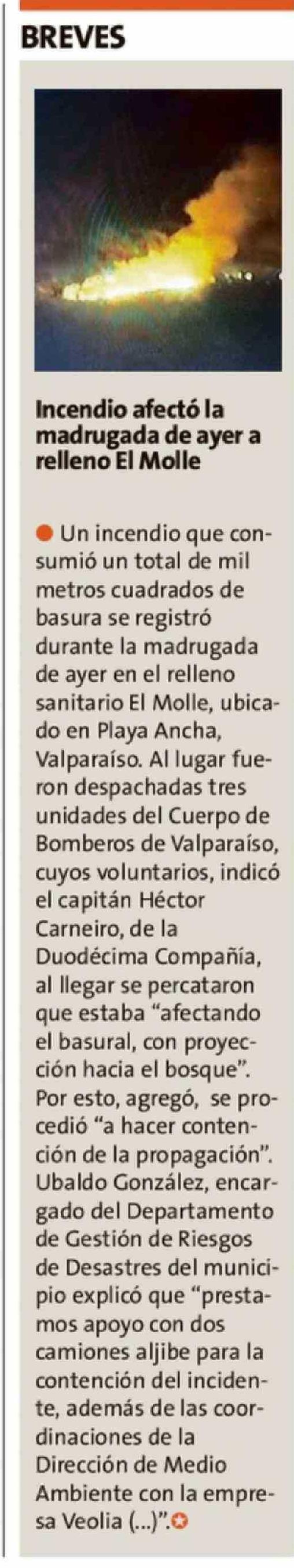 | Título: | Incendio afectó la madrugada de ayer a relleno El Molle |