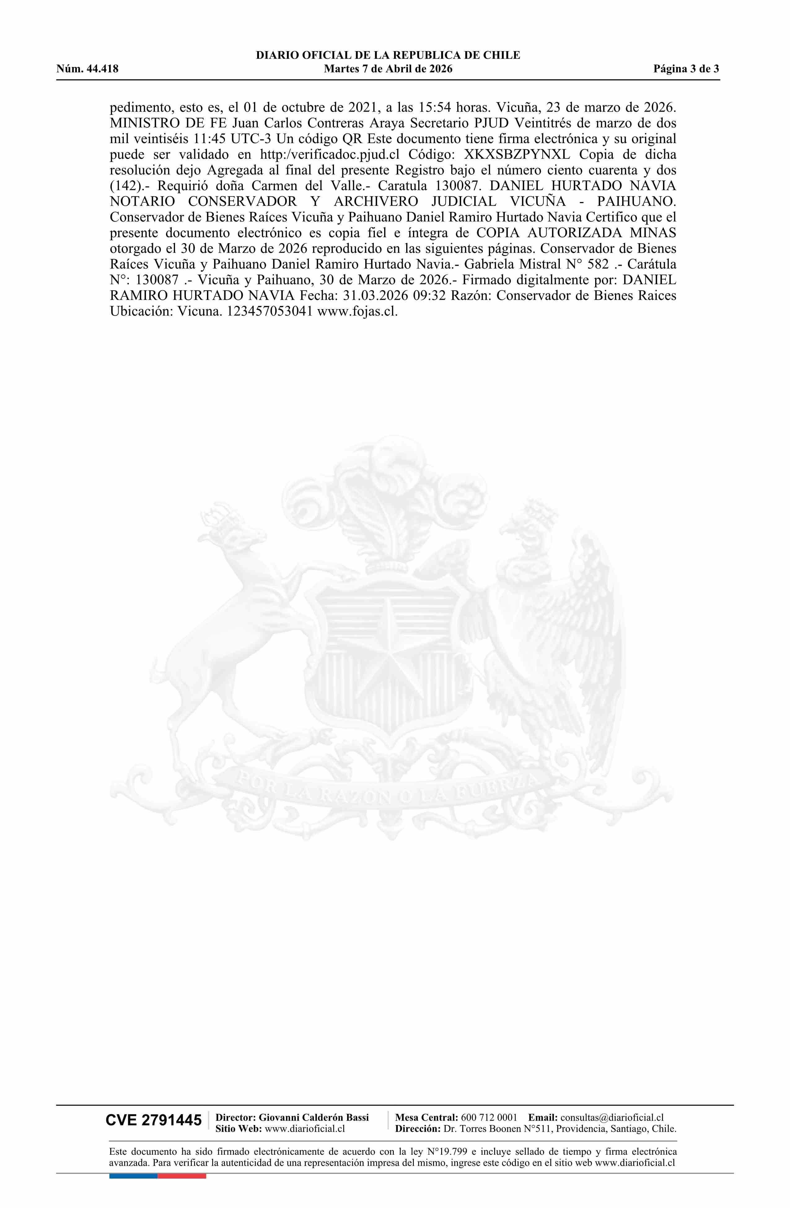 | Fuente: | DIARIO OFICIAL CHILE - BOLETÍN OFICIAL DE MINERÍA (DIARIO OFICIAL CHILE – BOM – MANIFESTACIONES MIN) | Página(s): | 20-22 |