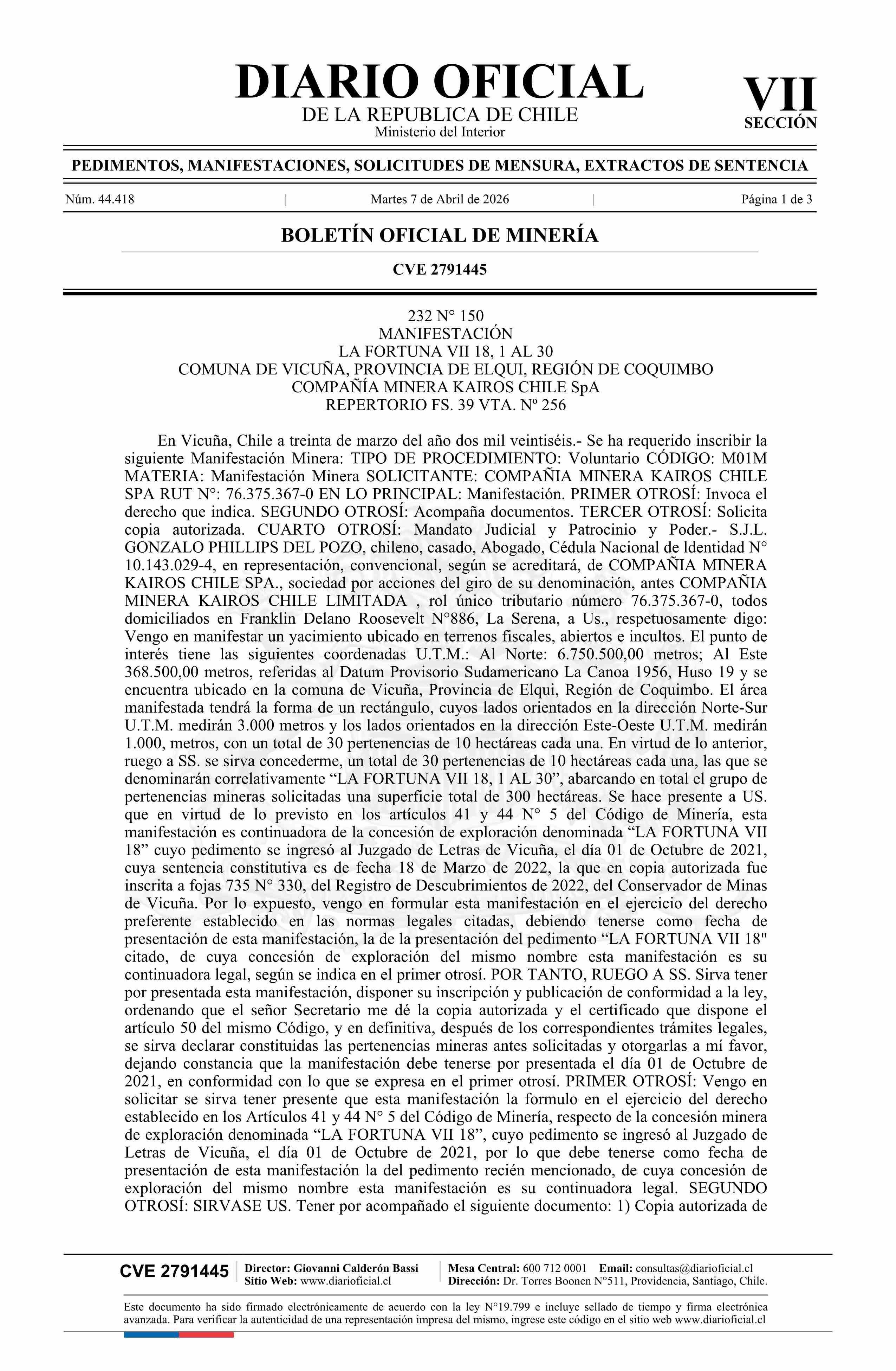 LA FORTUNA VII 18, 1 AL 30 / Compañía Minera Kairos Chile SpA 07-04-2026 DIARIO OFICIAL CHILE - BOLETÍN OFICIAL DE MINERÍA |